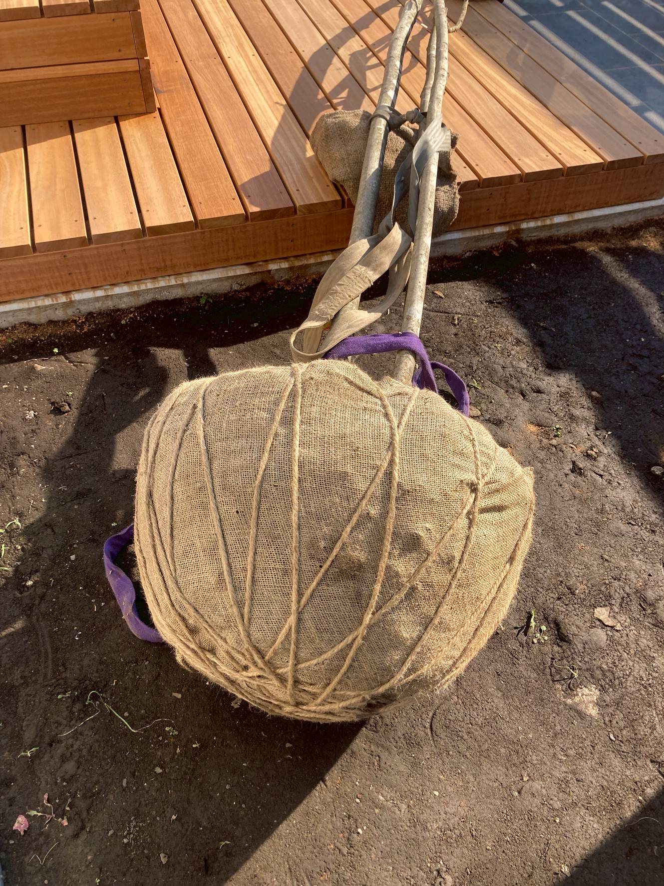高さが4メートルほどのアオダモなのですが、こんな大きさとなるとユニックという機械を使わないと植えられません。