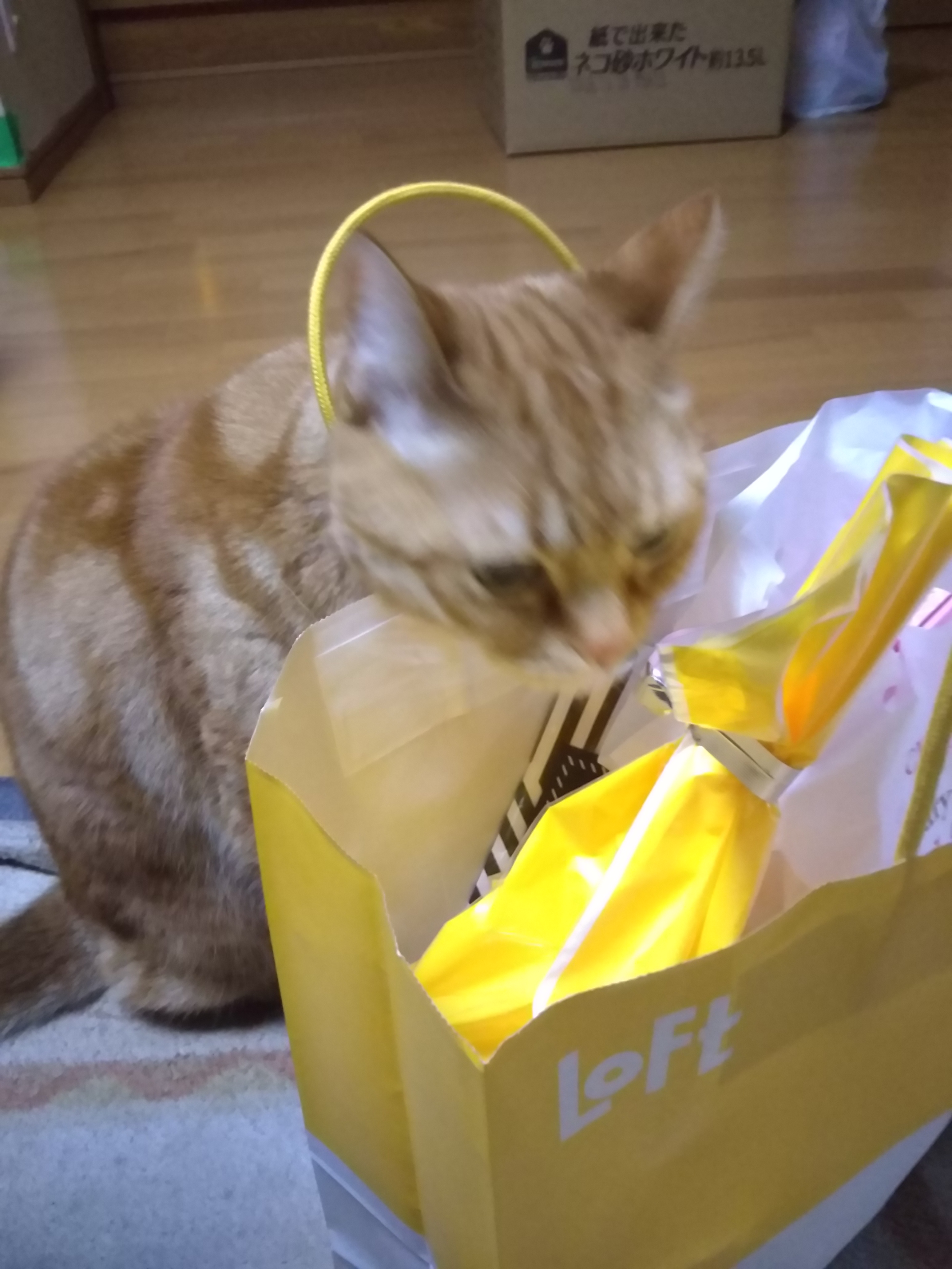 でんちゃんは触れるとカサカサ音がして、中に入れそうな紙袋の方が興味あったみたいです♪