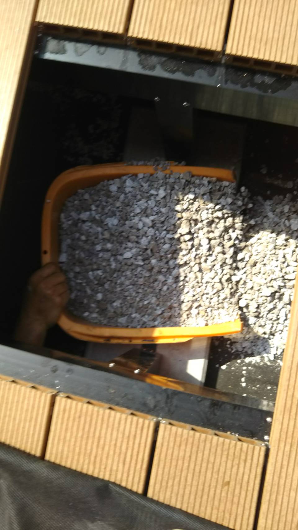 ウッドデッキ下の砂利入れ( 一一)!