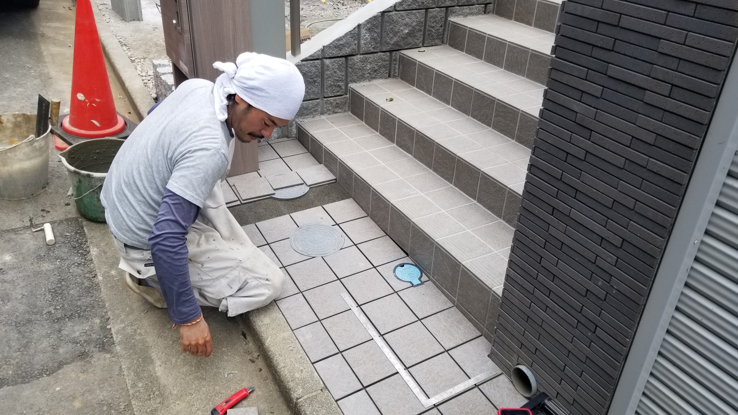 更に左官鏝に持ち替えタイルの下地左官、そしてタイル貼りと器用にいろんな工種をこなしていきます。
