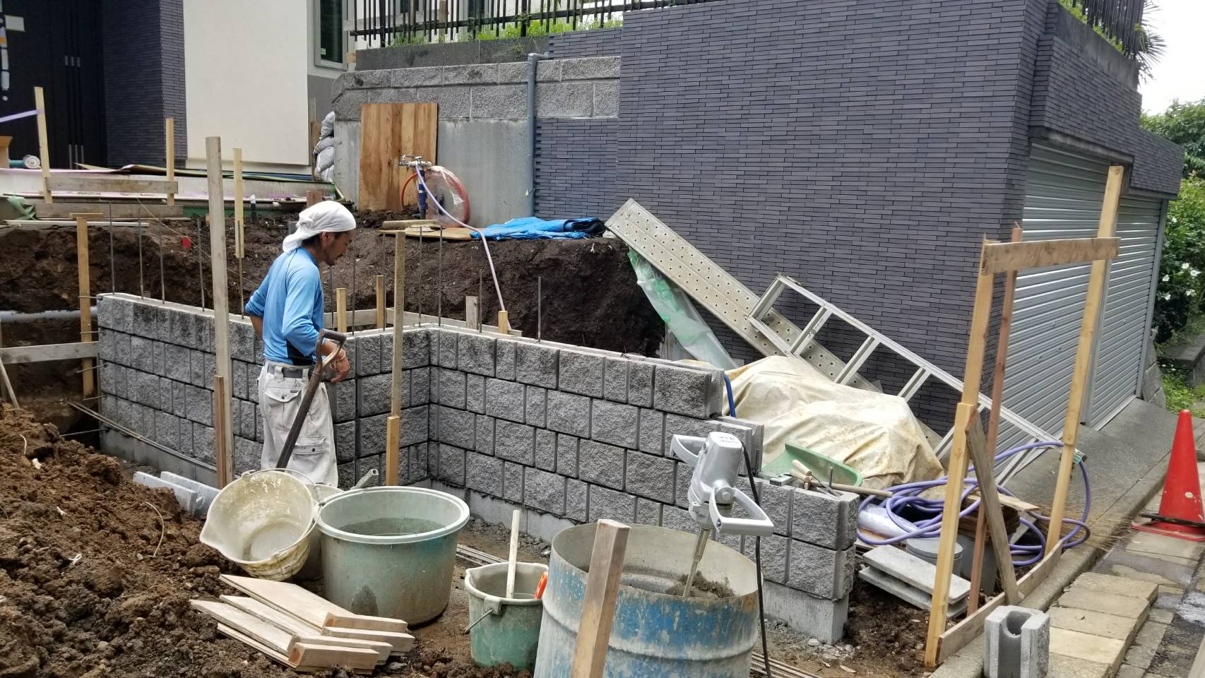 スコップを手に持ち土いじり!そしてスコップをブロック鏝に持ち替えてブロック工事!