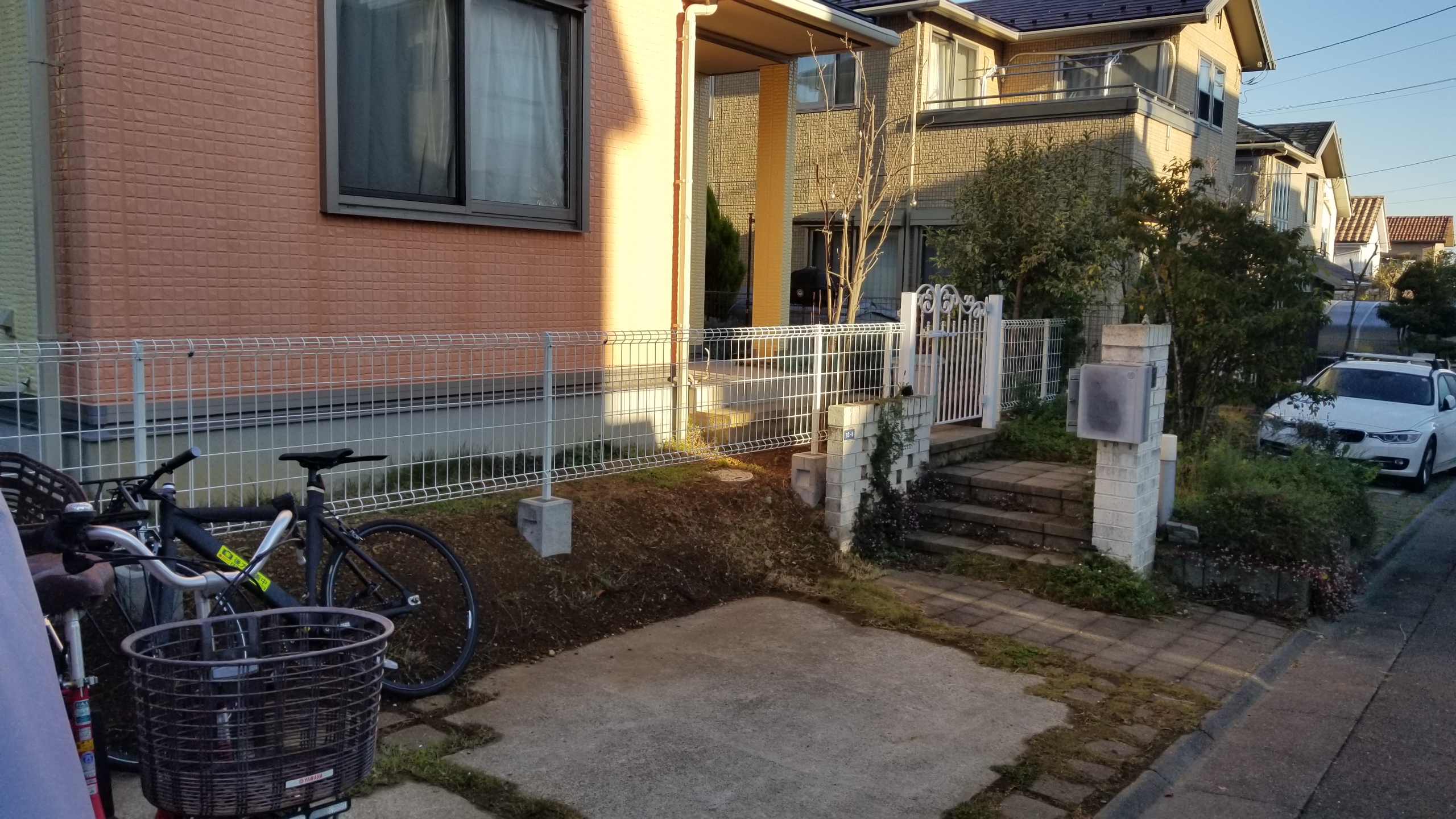 もともとあった門扉やフェンスを撤去、育ちすぎたローズマリーや枯れ始めた木などは処分して
