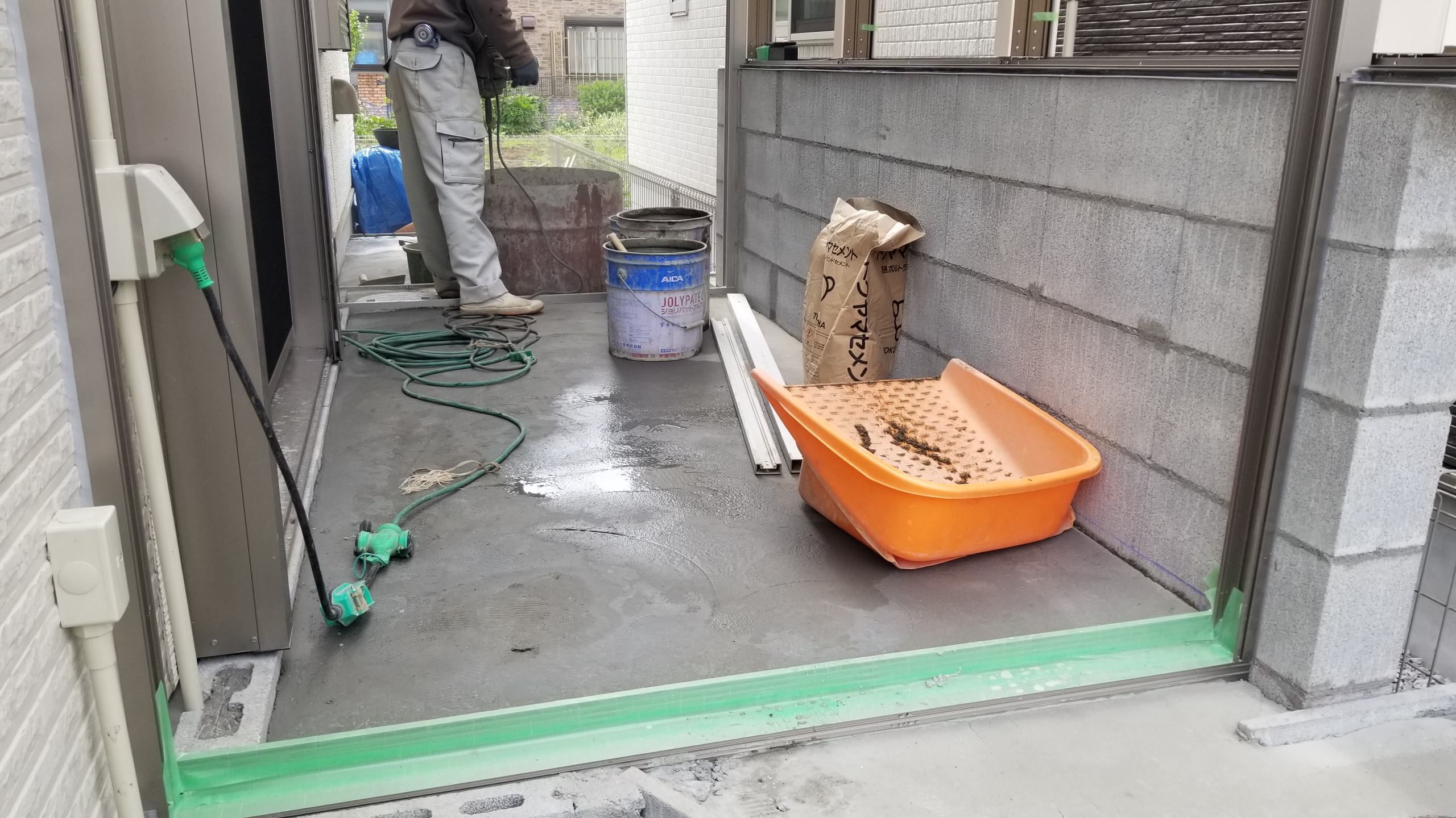 タイルを貼る厚みを逆計算、水勾配も計算の上、作業は黙々と進んでます。20190509_084519