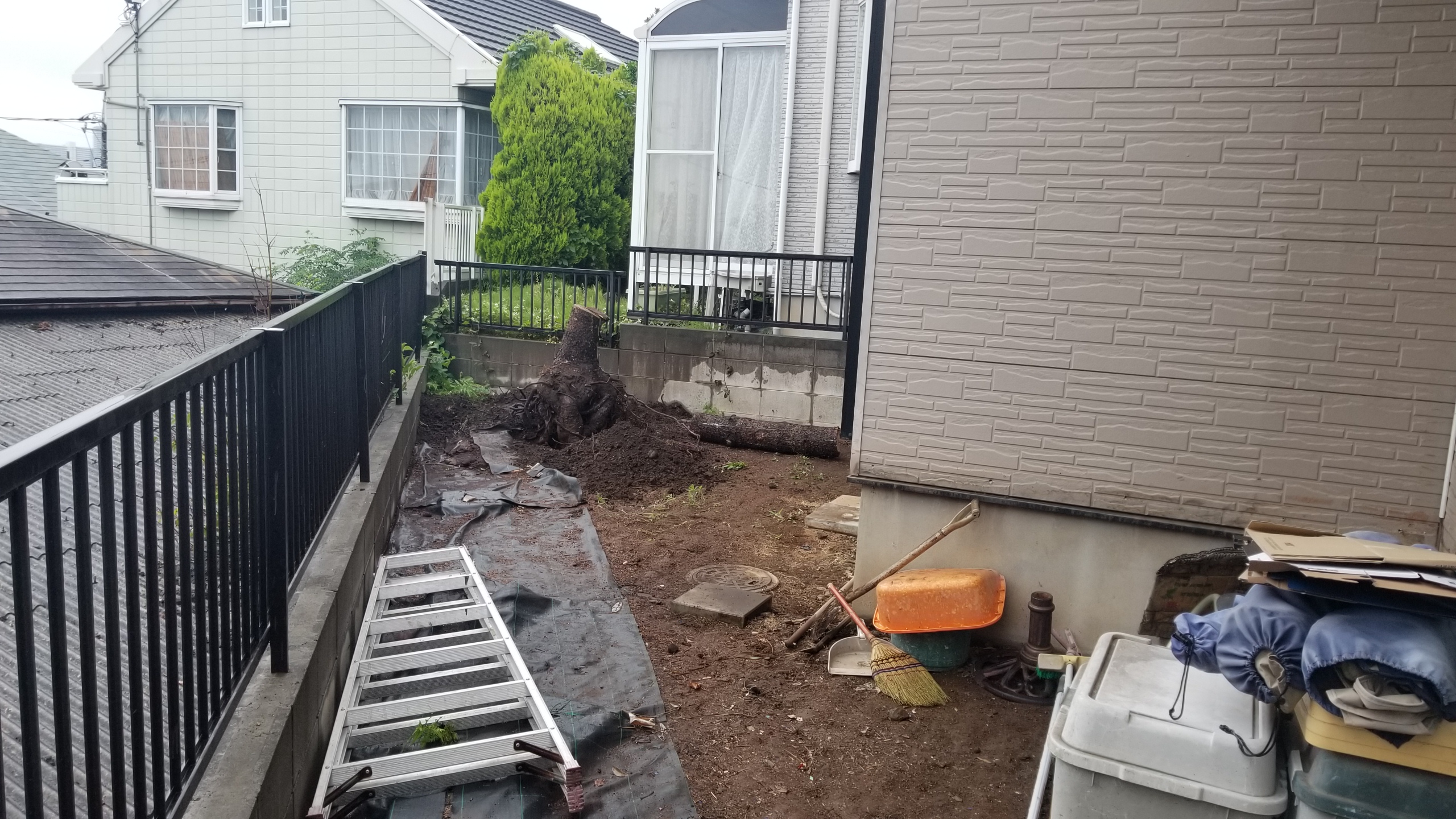 ウッドデッキの撤去が終わり土剥き出しの状態です。