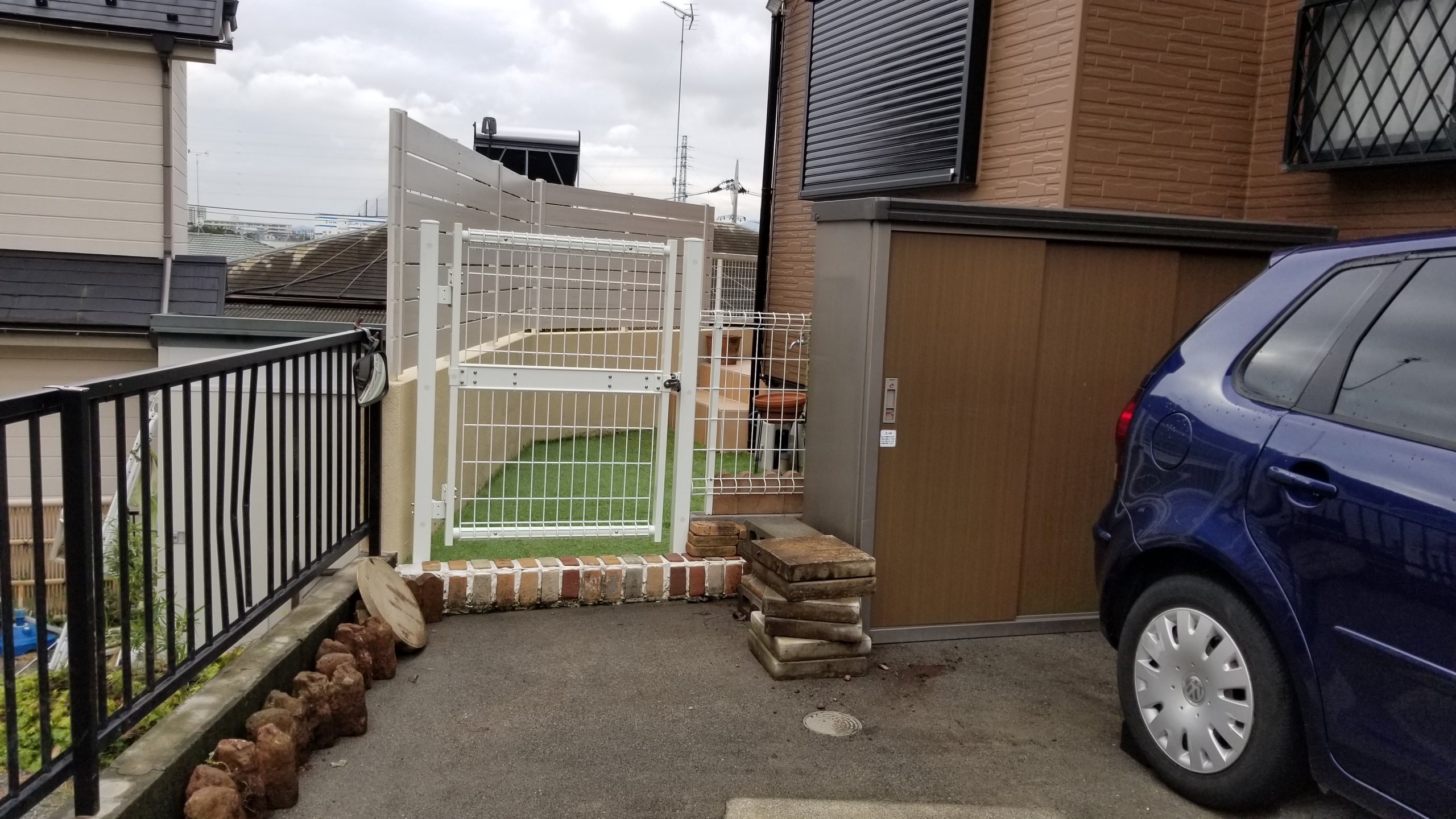 駐車スペースのオープンだった庭入り口に、門扉とフェンスを取り付けました。