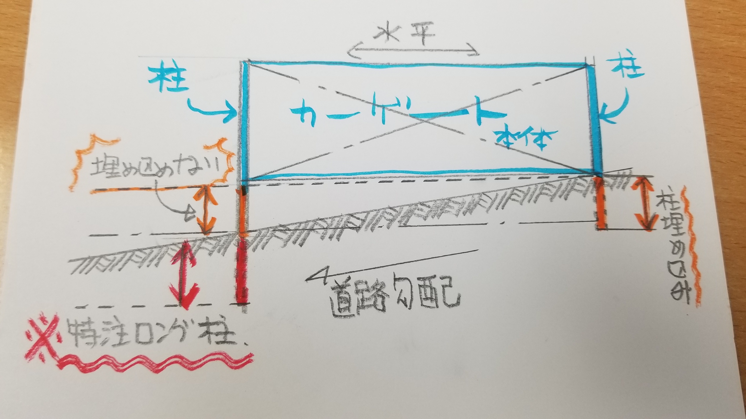 道路の高い場所に合わせて柱を固定すると、低い部分の柱の呑み込みがなくなってしまいます。