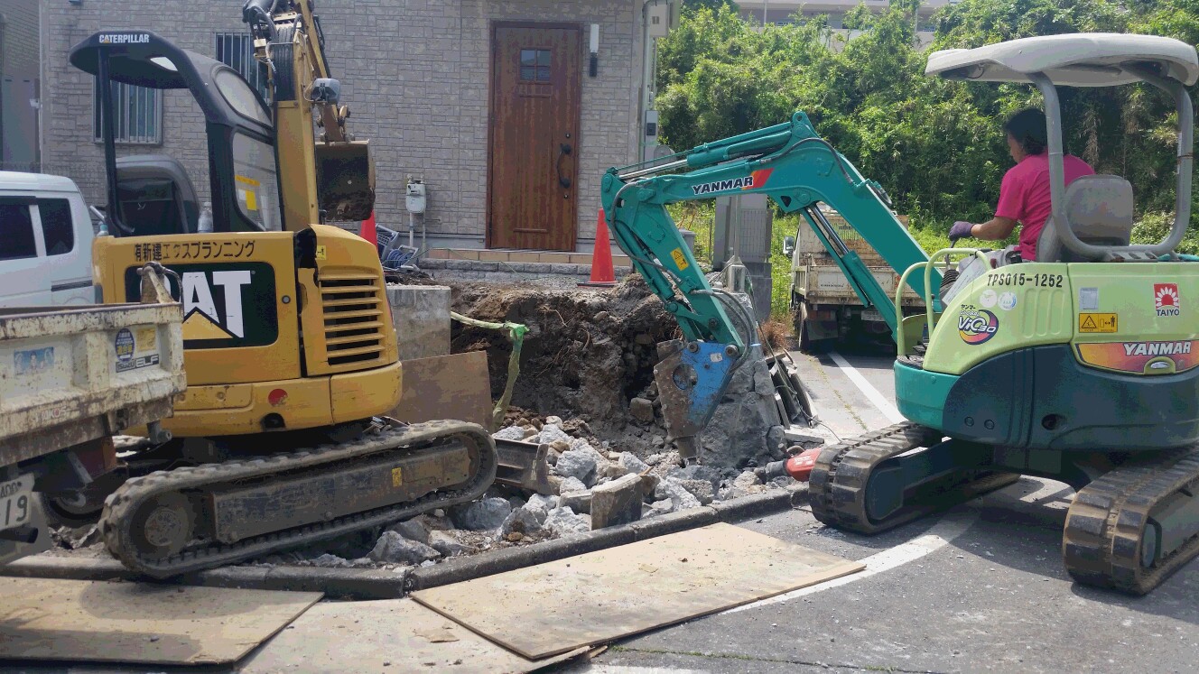 調査の結果水道や塩ビ管は問題ありませんでしたがガス管の切り回し移動が必要となりガス会社にも立ち合ってもらい工事工程を打合せして後日擁壁を壊し始めました。