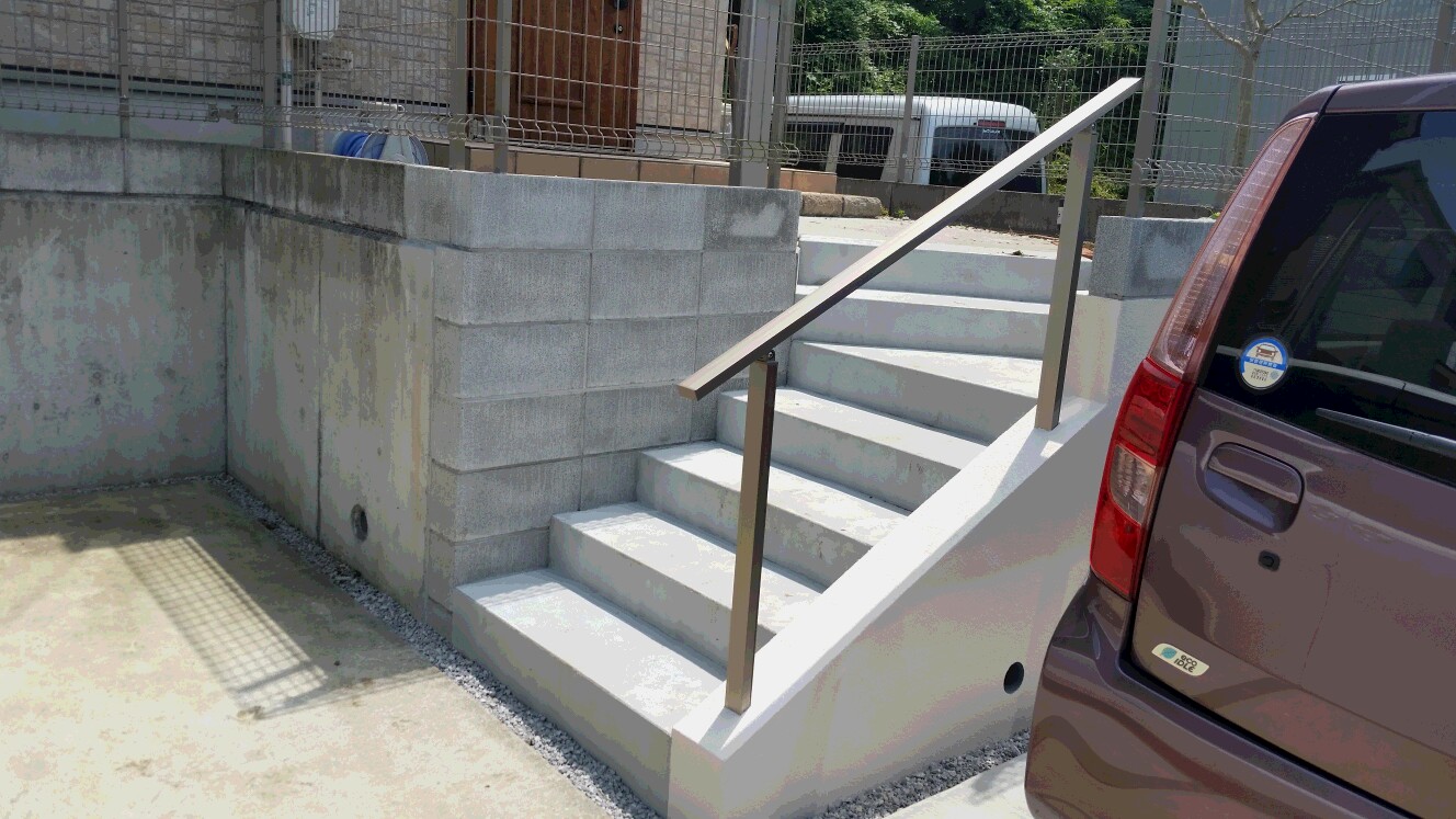 打合せの段階でイメージはしていたものの実際に完成してくると道路と同じ高さになる部分の面積の広さに大変満足な施主様、スッキリとした階段とご希望通りの駐輪、駐車スペースの完成に喜んで頂きました。