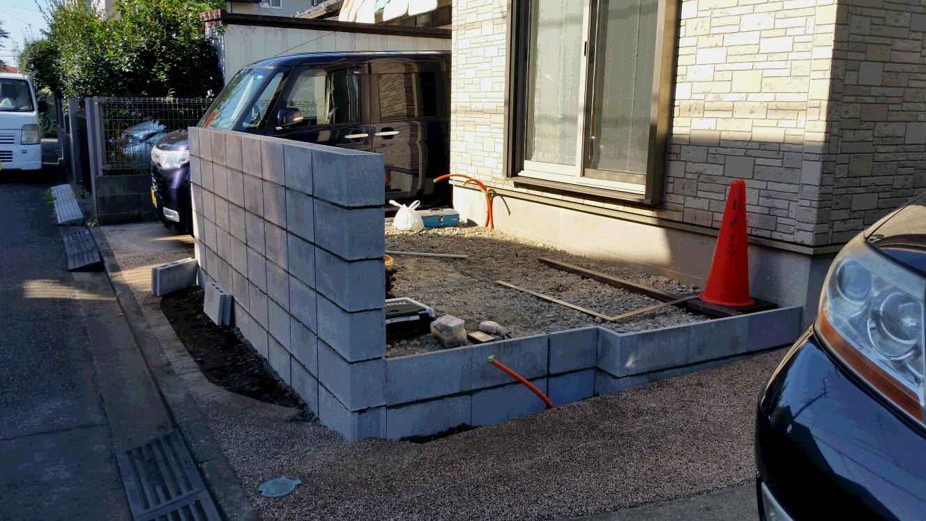 先ずは育ってしまった針葉樹を伐採・抜根、テラス下地をブロックで造作、腰壁になる部分も基礎工事をしっかりと高さも打ち合せ通りに作業を進めます。20161015_084105