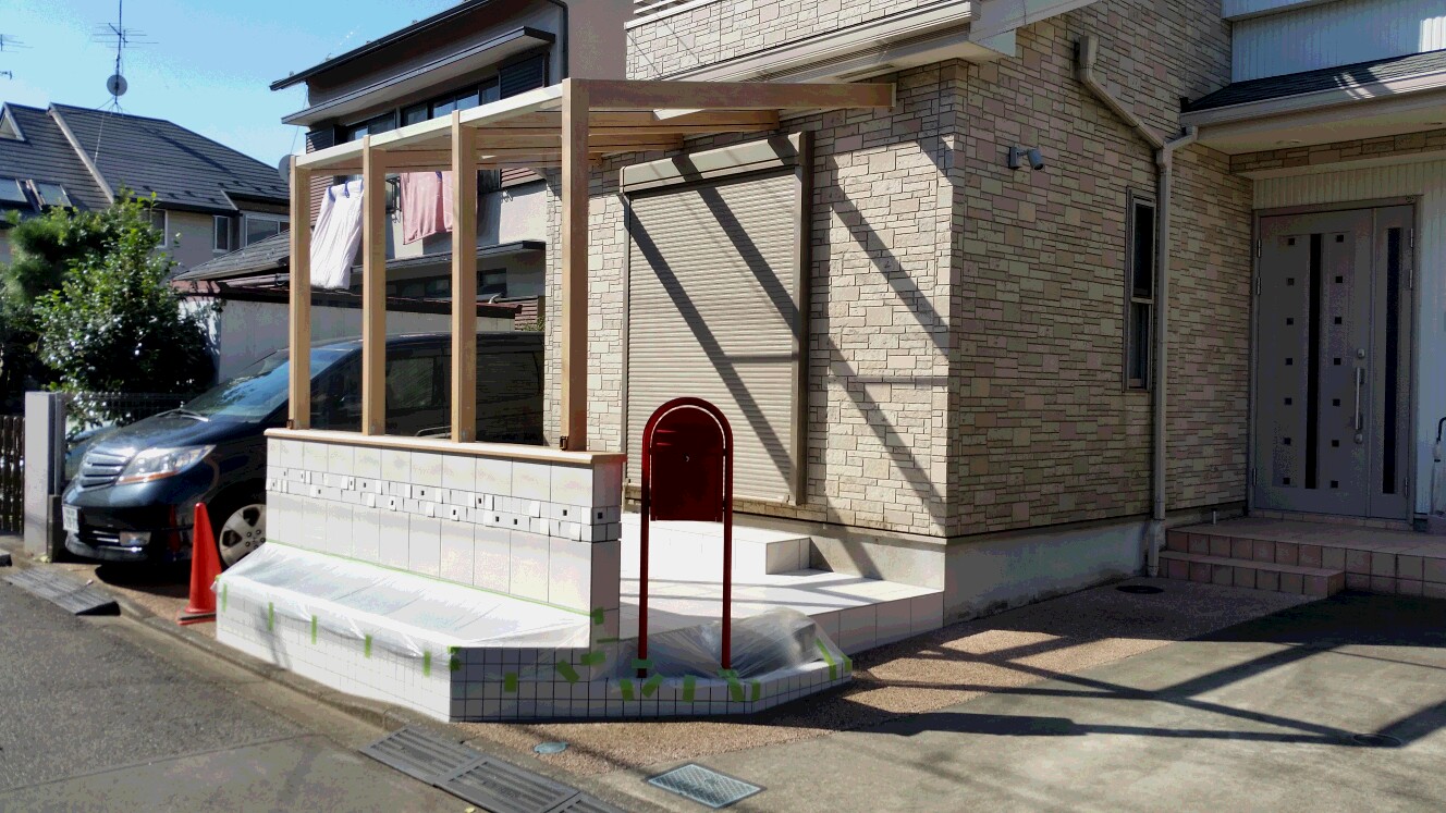 先ずは第一印象となる全体のバランス!製品自体に高さの設定がいくつかありますので現地にてスケールを当て丁度良い高さの打ち合せ、製品を持ってくるわけいきませんので想像で決めます。取付工事を楽しみにしていましたが見た目のバランスはどうか気を止んだと思います^_^; 完成して丁度良いバランスに施主様も喜んでいました。20161019_082822