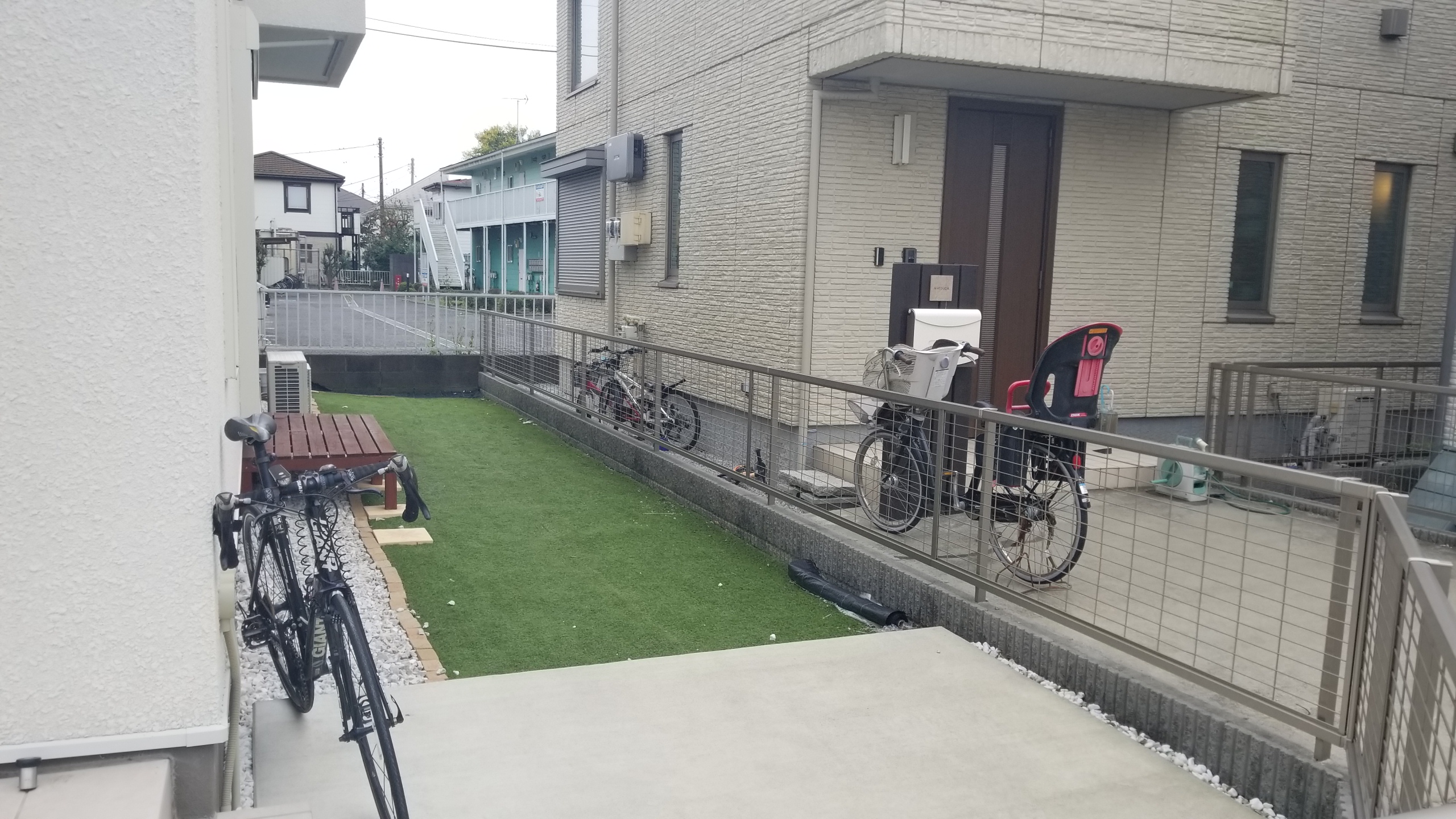 雑草対策兼、子供たちが遊んでも泥だらけにならないように人工芝を敷き詰めただけのお庭が・・