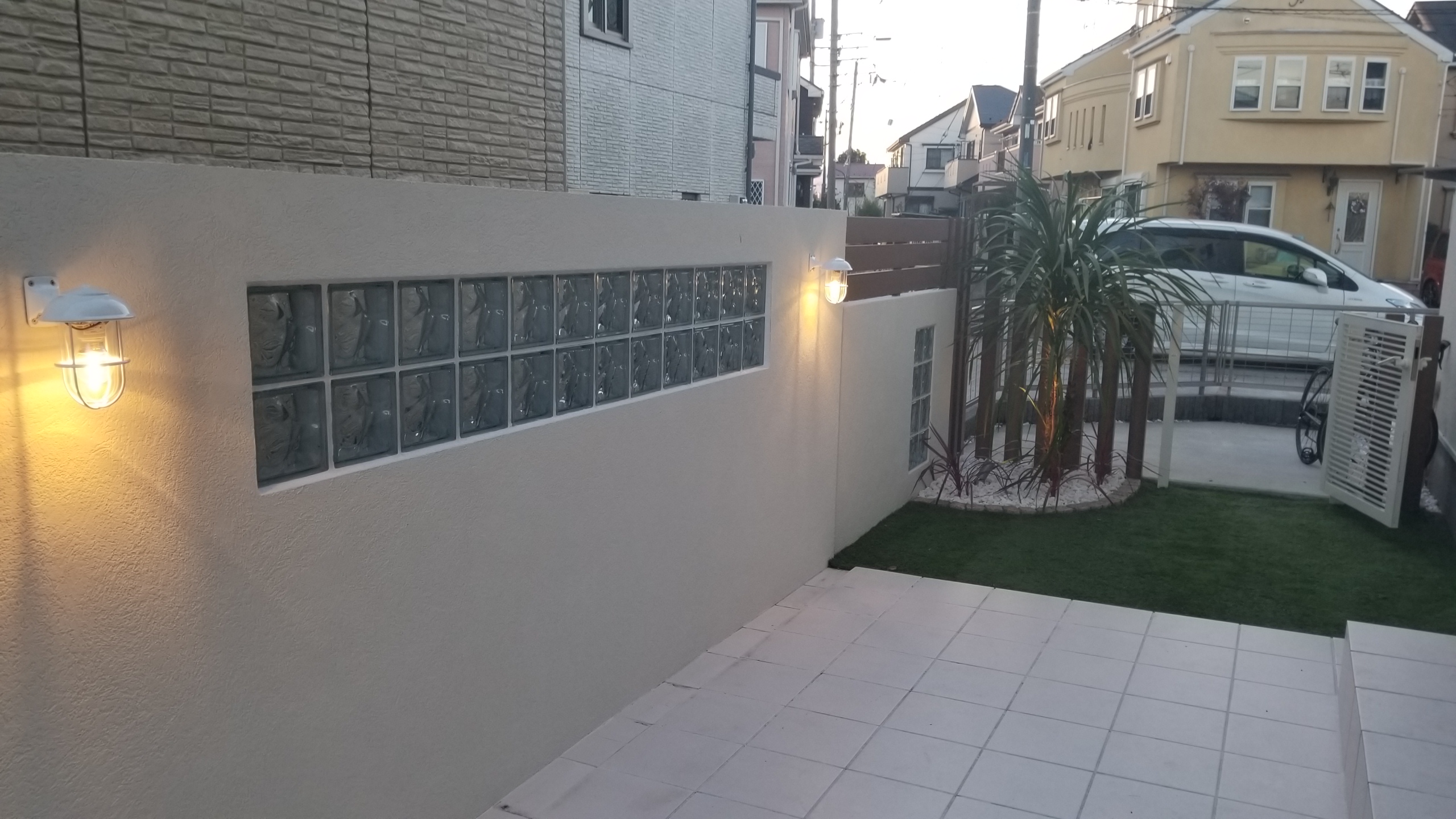 ガラスブロックをふんだんに使ったガーデンウォール、モダンで清潔感のある仕上がりになりました。