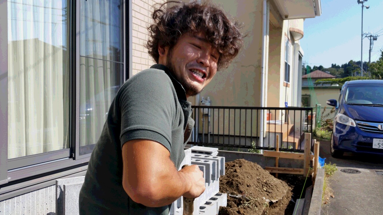 デッキを撤去してテラス下地の基礎が始まったばかり、担当職人の宏樹も規模の大きな現場に遣り甲斐を見せてこの表情(笑)
