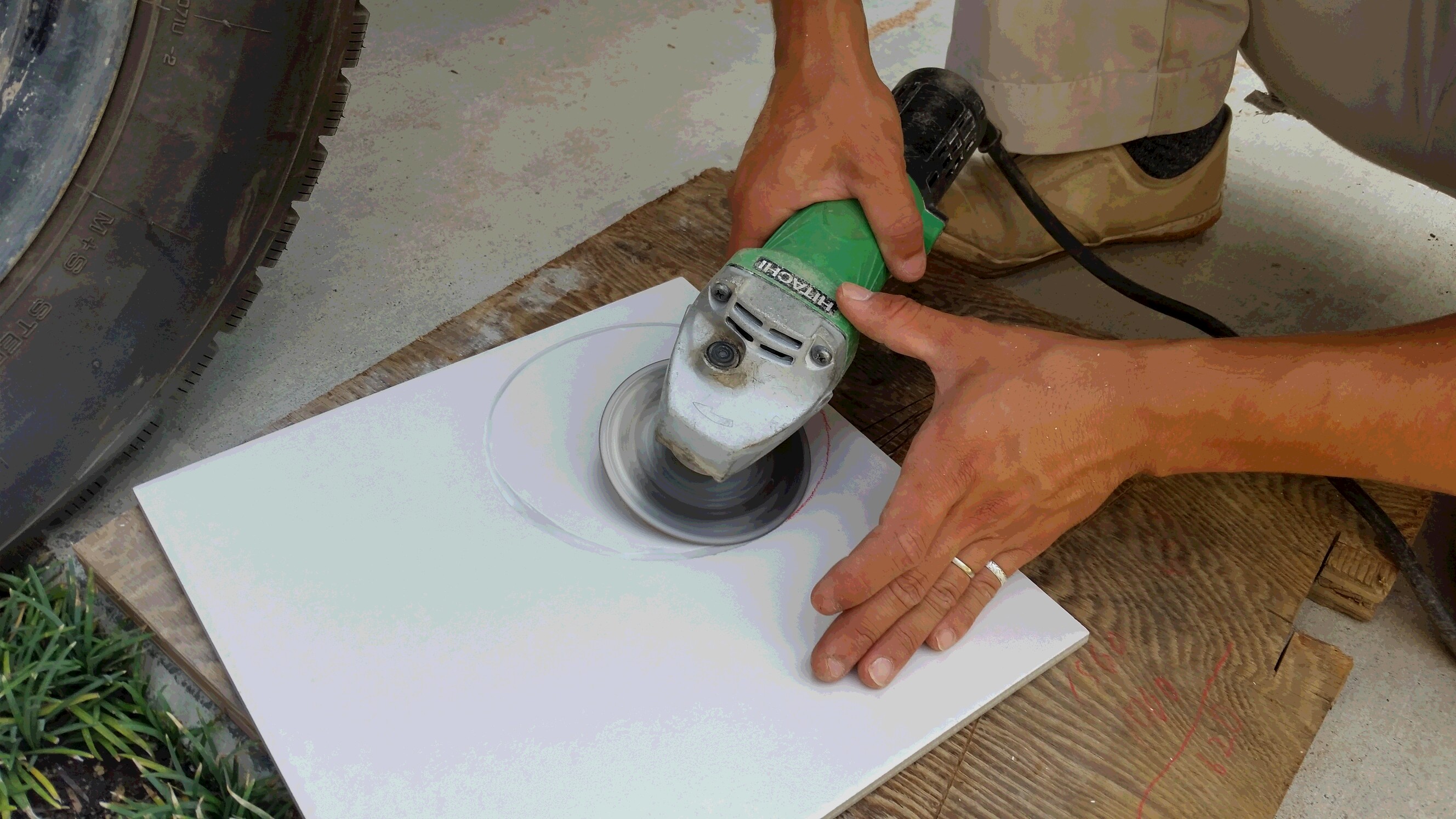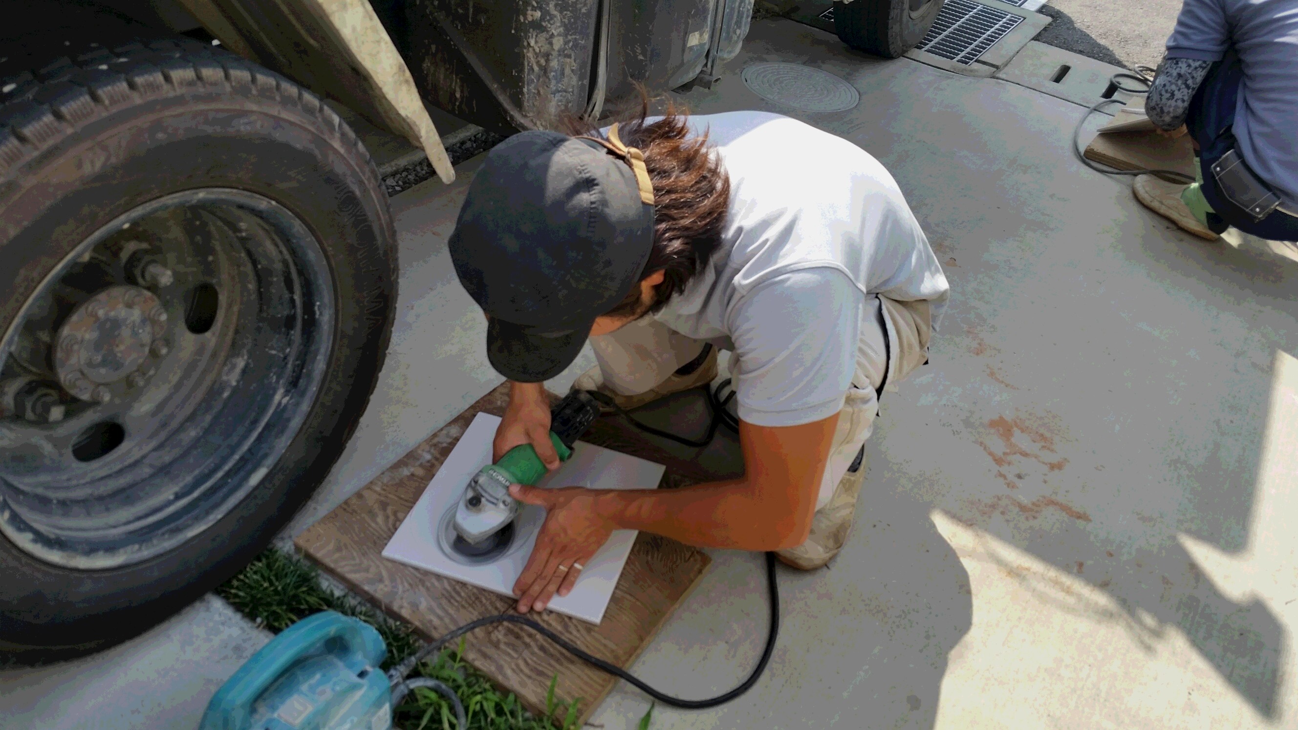 工事進行のスピードにお客様もびっくりしていましたが、ここから仕上げ工事!高度な技術と丁寧さが要求されます。早速障害物が・・これこそ職人さんの腕の見せ所!桝の形に合わせて切断する部分にしるしを、そして切断作業開始・・・