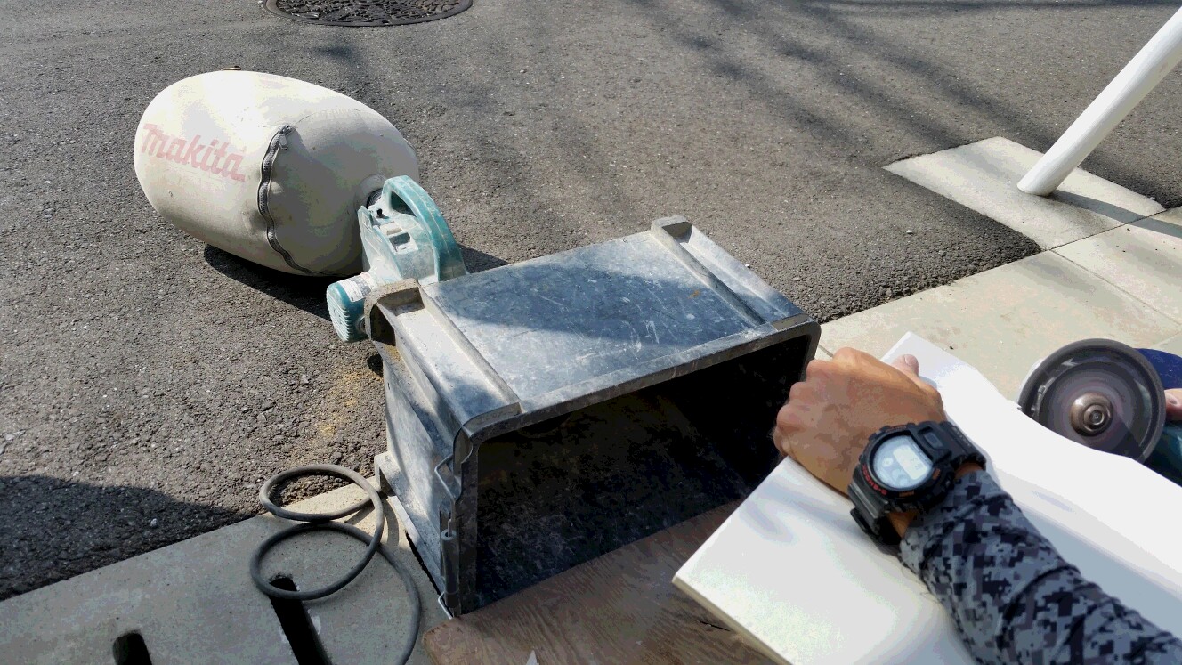 ブロックやタイルなど切断すると粉じんが飛び散ります、切断するときには必ず集塵機を使い近隣にご迷惑が掛からないよう心掛けています。切断時の音だけはどうにもなりませんので工事前に近隣の方たちに声をかけご協力をお願いしています。ご協力ありがとうございます。<m(__)m>