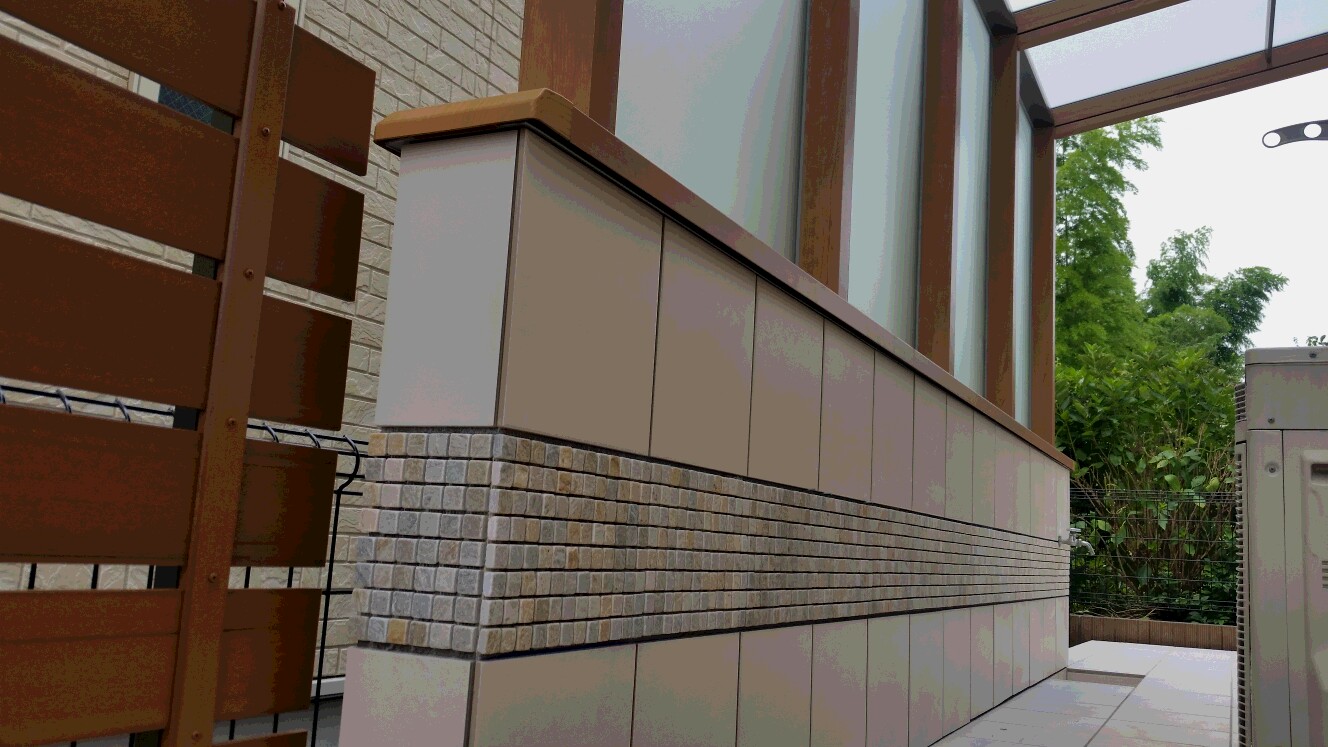リビングルームからの延長、タイルのテラスにお洒落な腰壁仕様のテラス屋根(LIXILココマサイドスルー)をご提案!