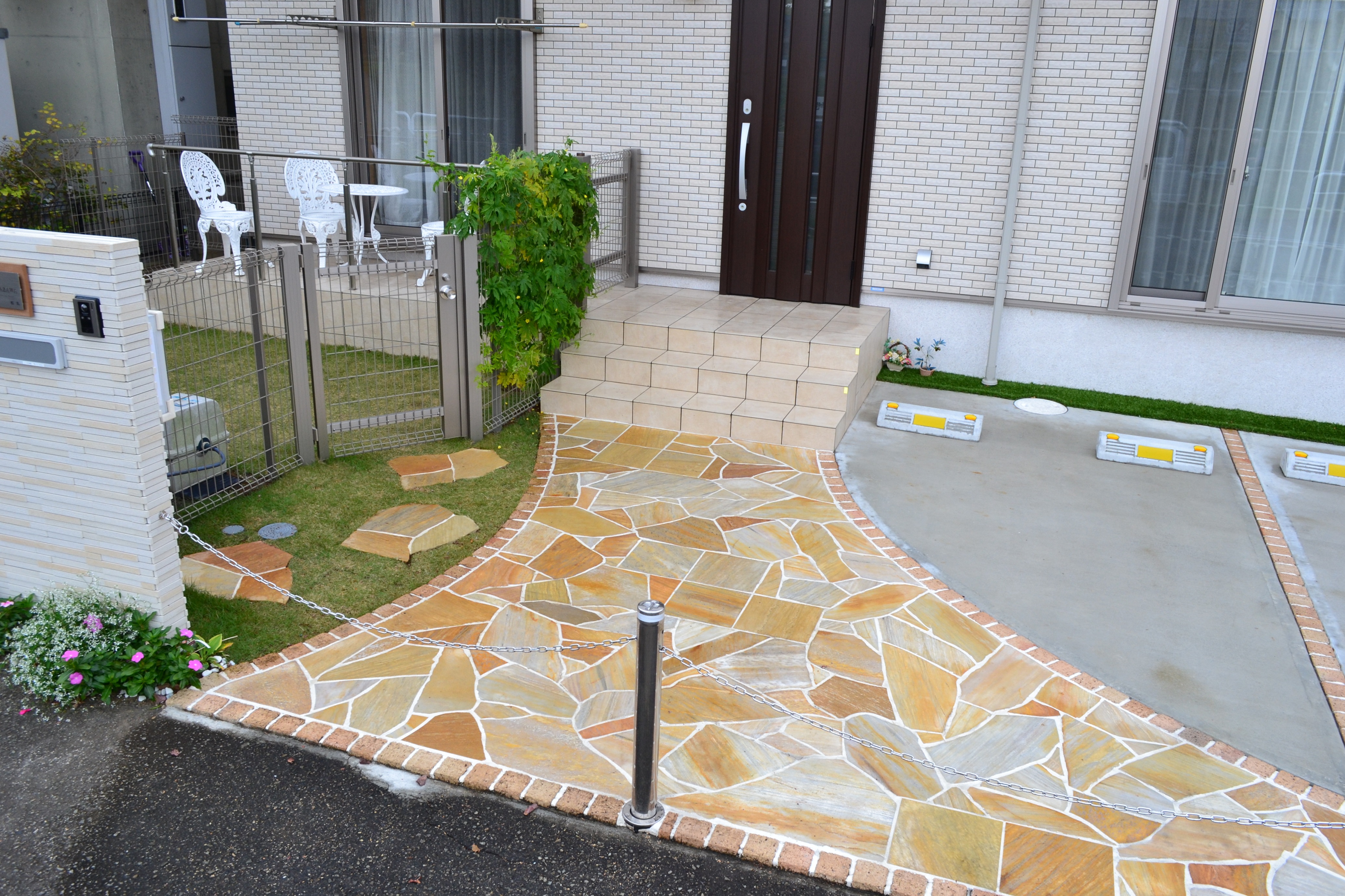 アプローチからそのまま駐車スペースまでデザインされた乱貼石。