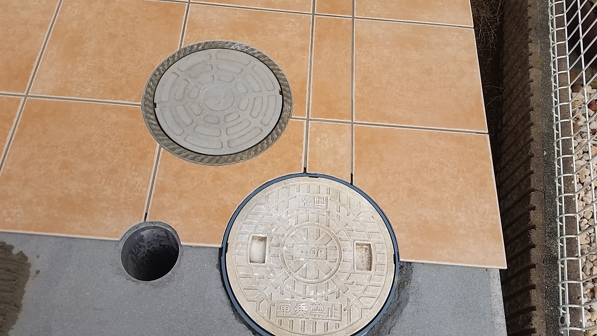 タイルを一枚一枚丁寧に丸く加工!三つの排水升が一枚のタイルに・・・加工中にタイルが破損しないよう慎重な仕事が大切です。