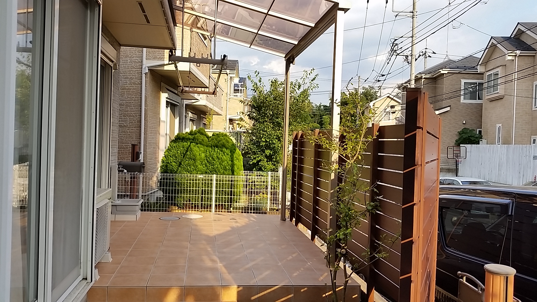 テラス屋根、目隠しフェンスを施したタイルテラスが完成しました。