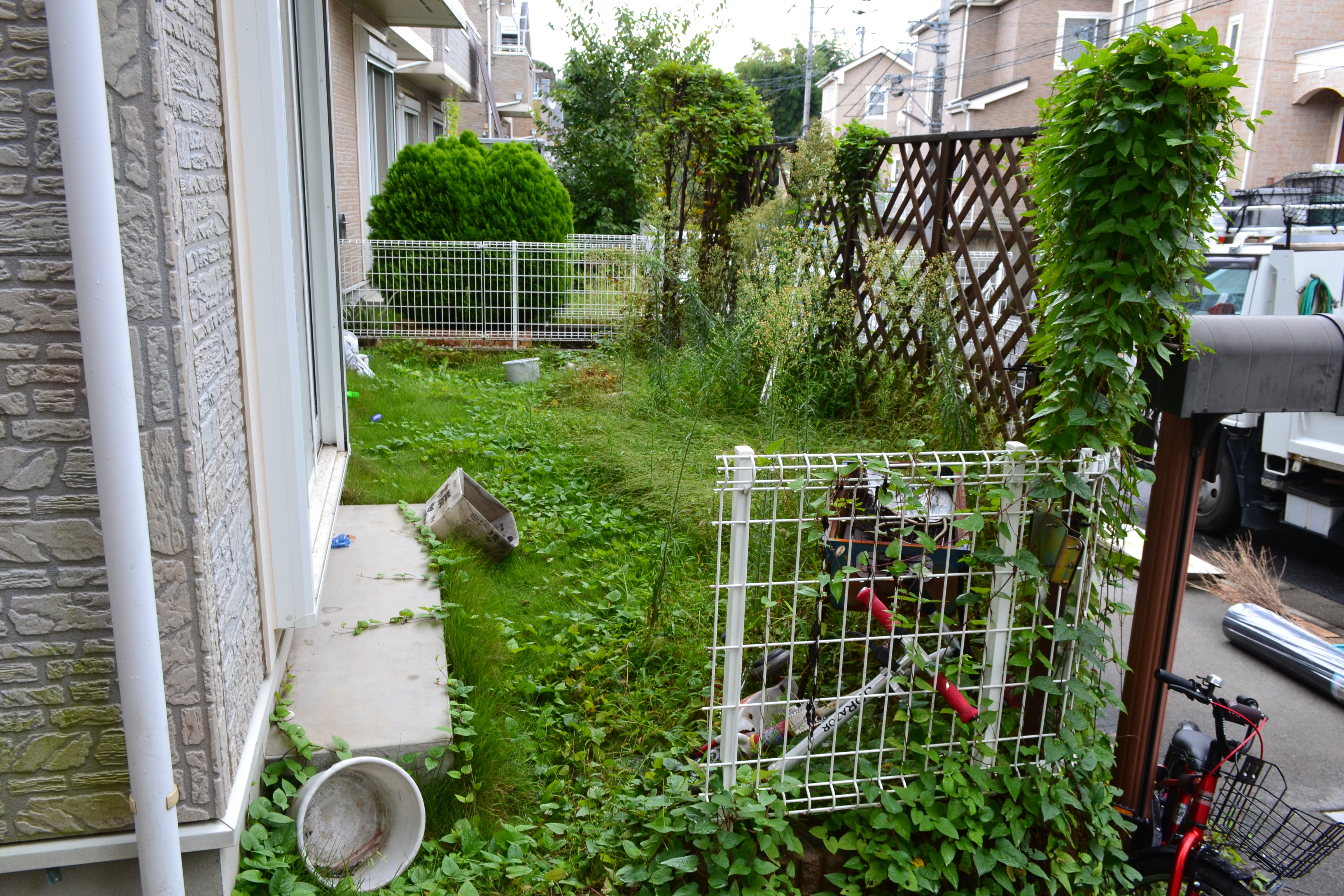 着工前は、庭に出るのも躊躇してしまうほど草に覆われていて使いようのないスペースとなっていました。