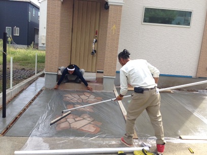 現場担当の深谷氏、黙々と作業に集中!手元近くに排水升が見えていますが、綺麗に収めるのは職人の腕の見せ所でもあります。