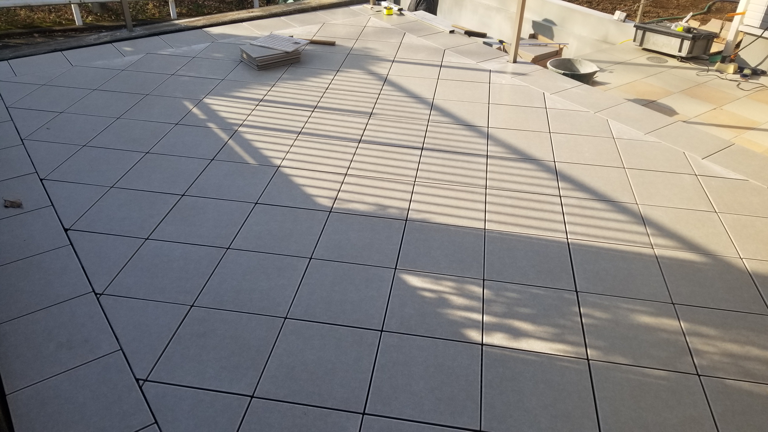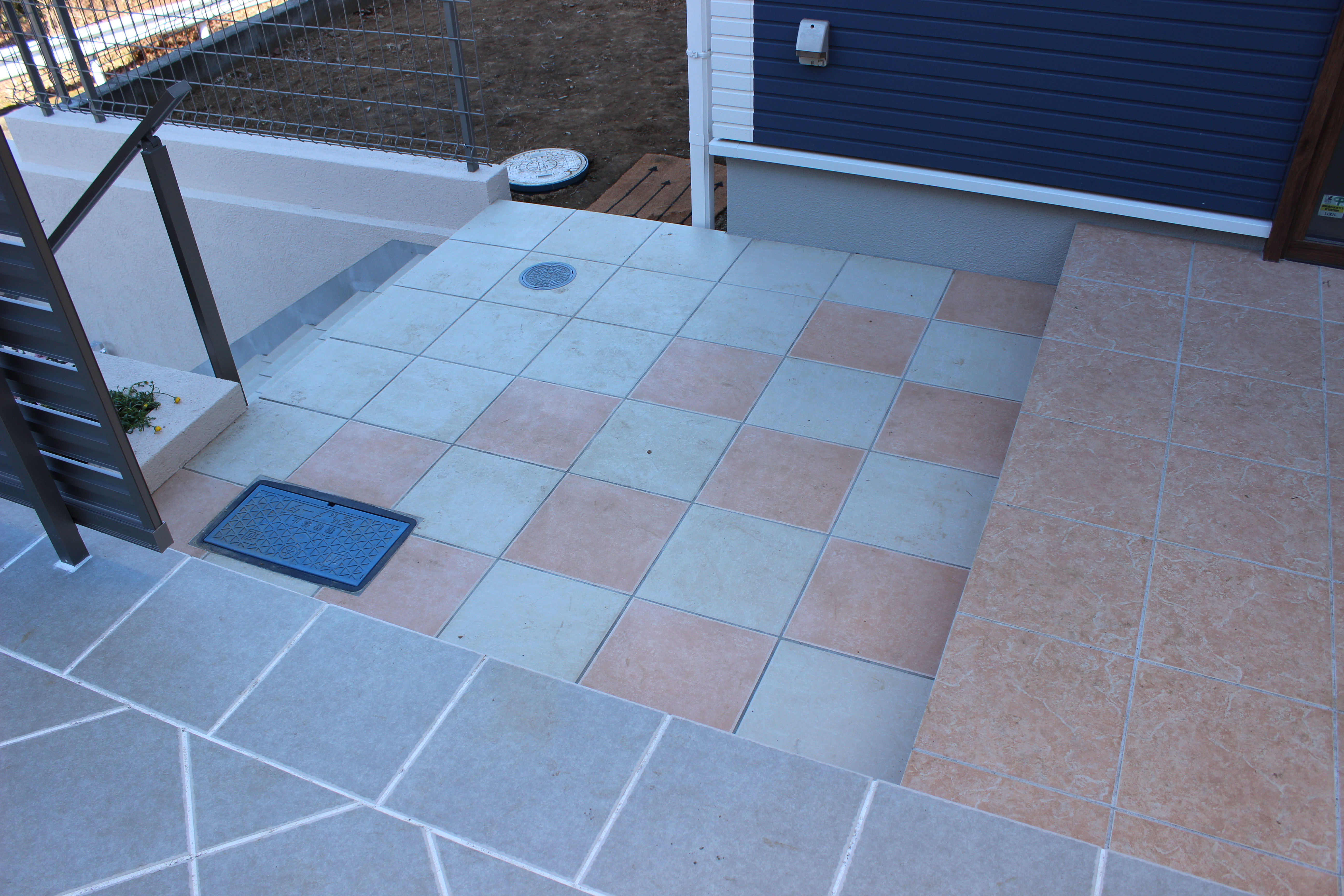ブリックタイルでは目地が細かくうるさく感じた通路も、だいぶ落ち着いた雰囲気に変身です。階段上の踊り場と、下のガレージ前はチドリにタイルの色を変え、アクセントにしました。