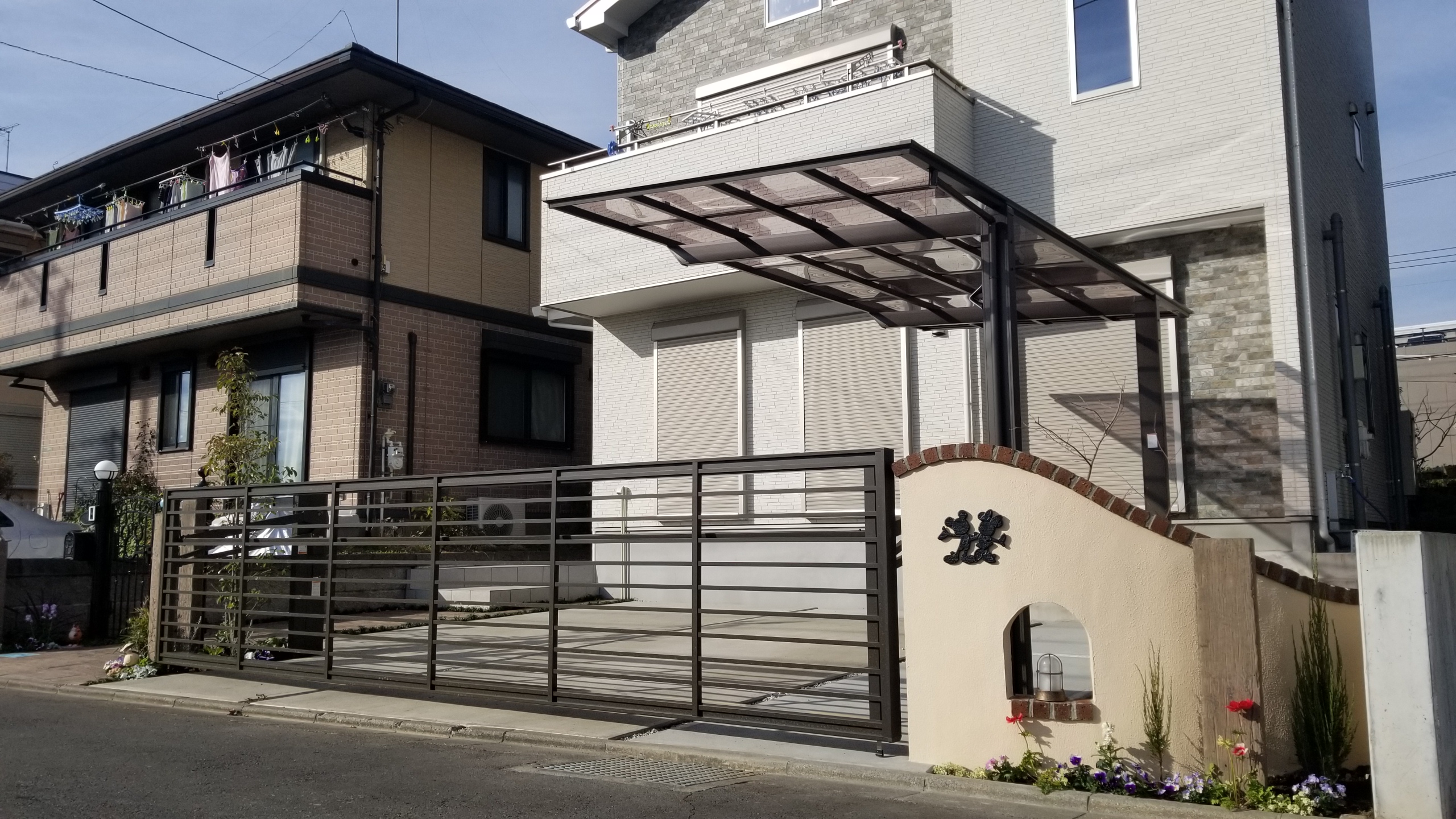 ディズニーシリーズの門にオーバーゲートとカーポートがプラスしてガラッとイメージが変わります。