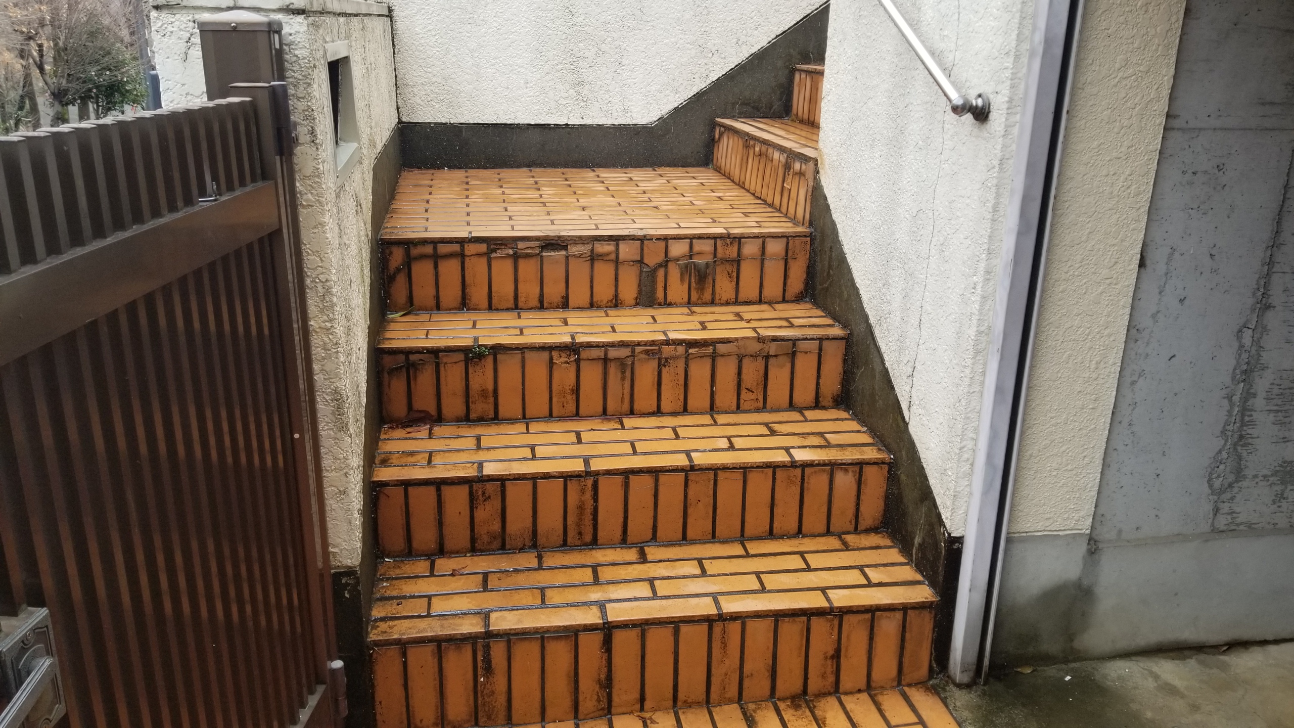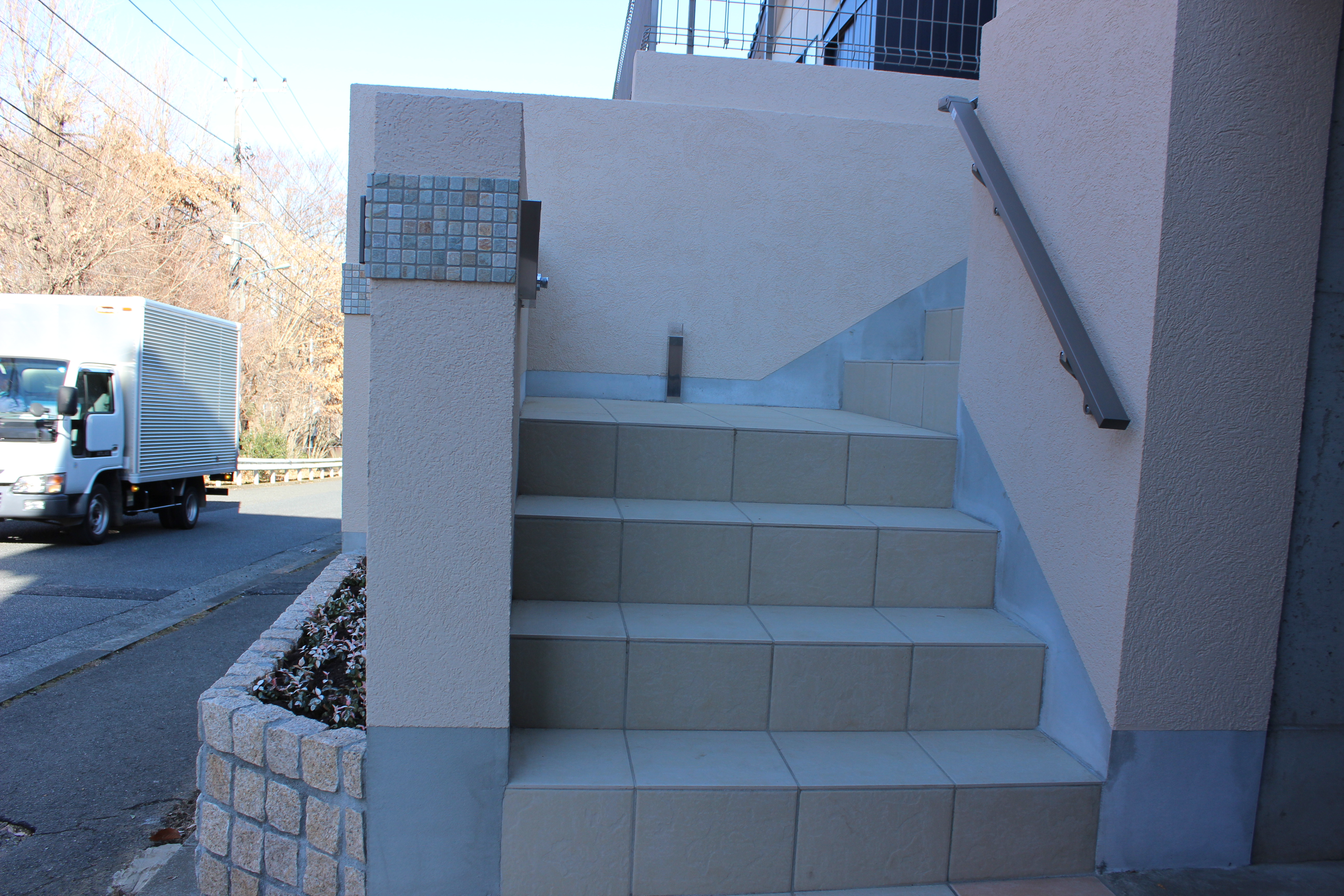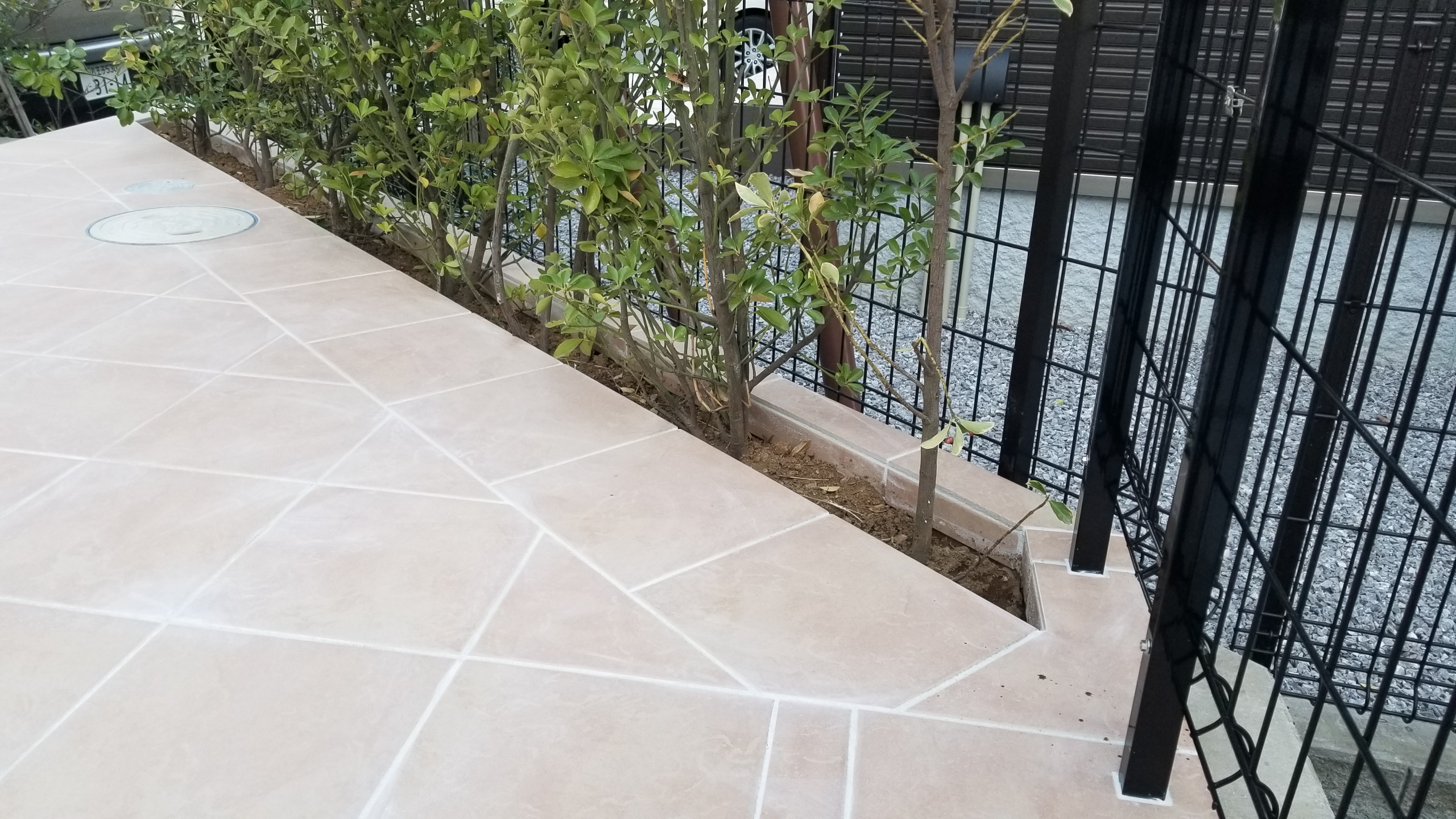 ベージュのタイルにすることでアプローチステップがだいぶ明るいイメージになりました。