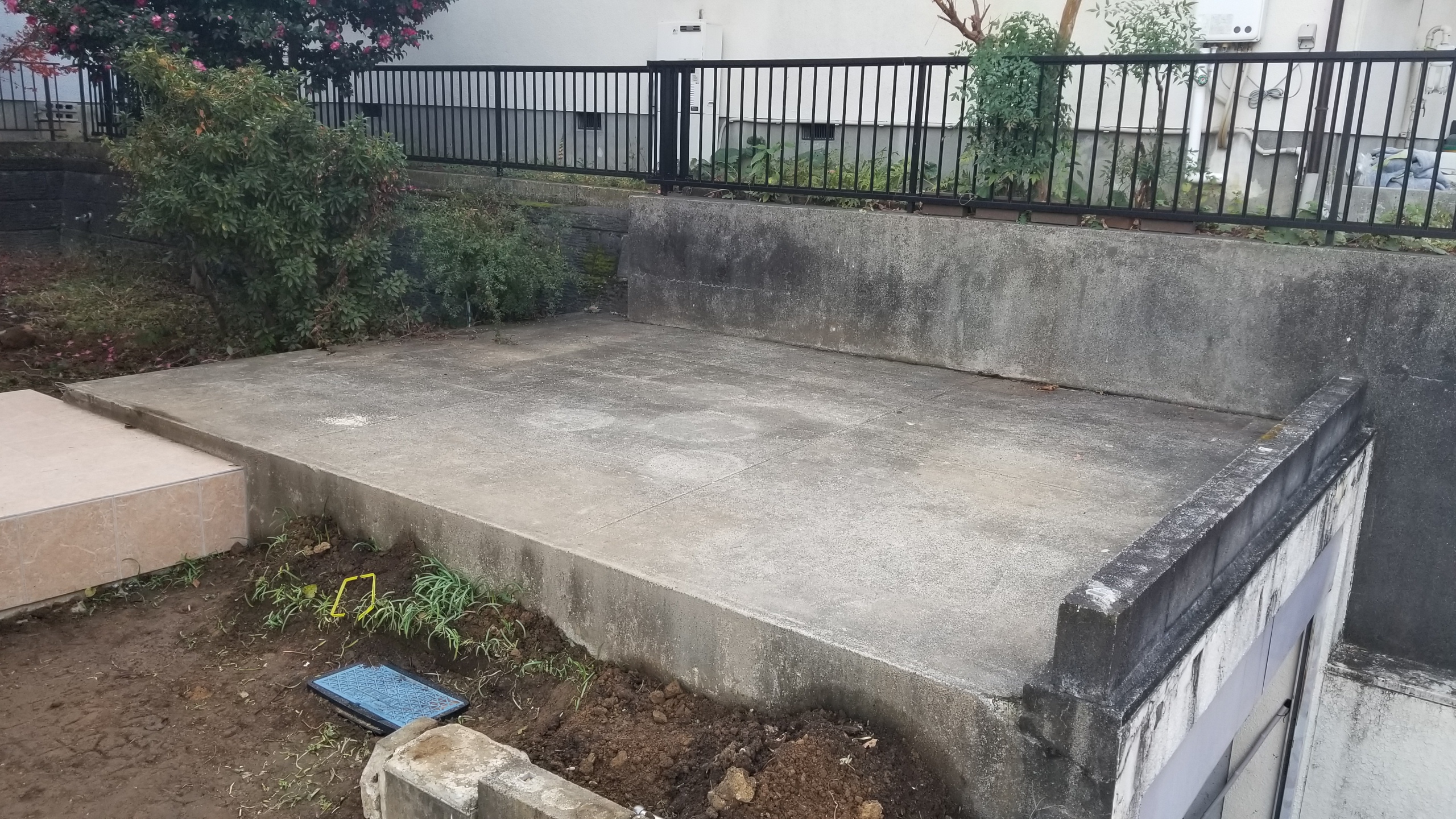 庭にビルトインガレージのコンクリートがむき出しになってました。