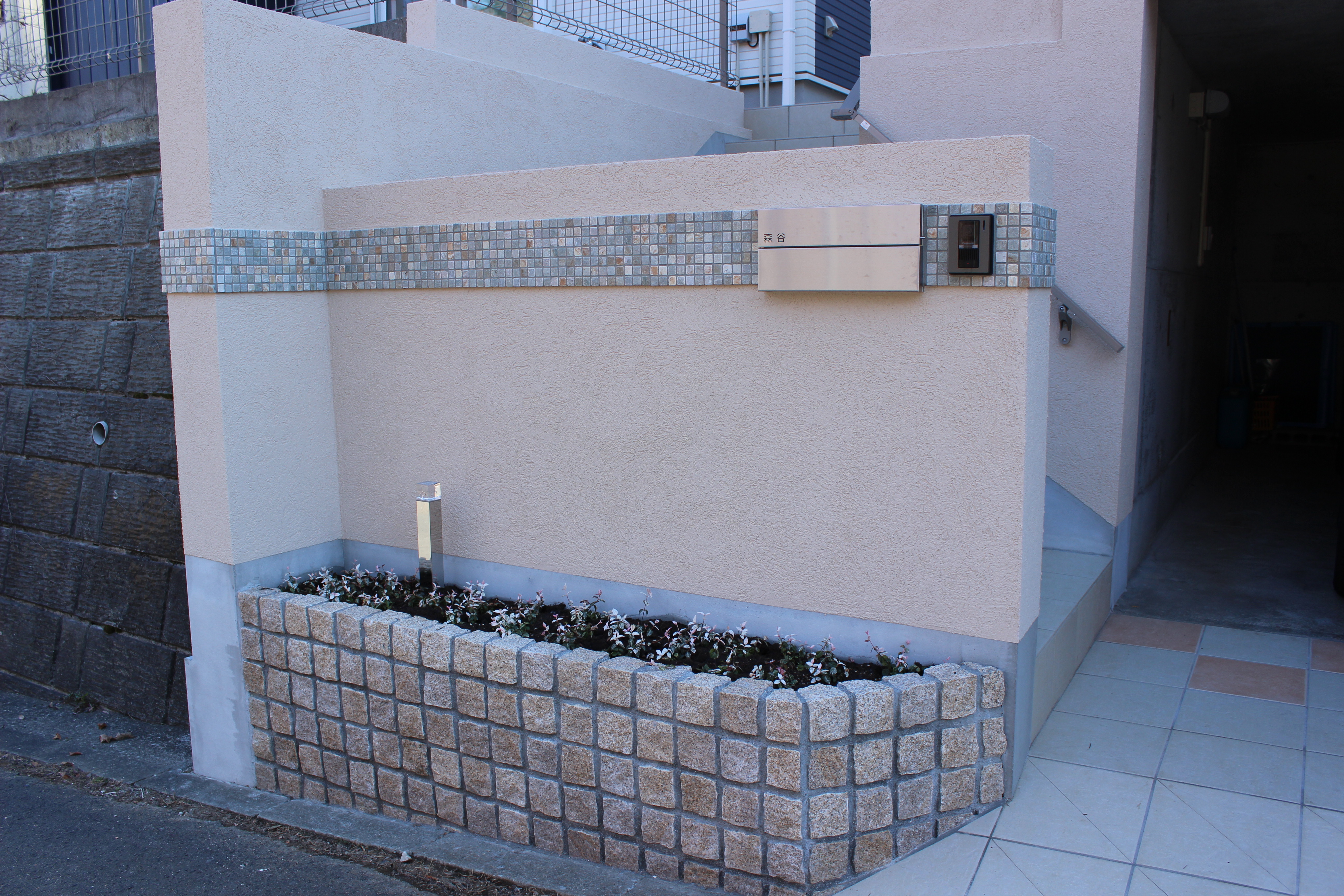 家の顔となるメインの門袖は、ポストもステンレスの商品に取り換えモザイクタイルを施し見違えるように綺麗になりました。