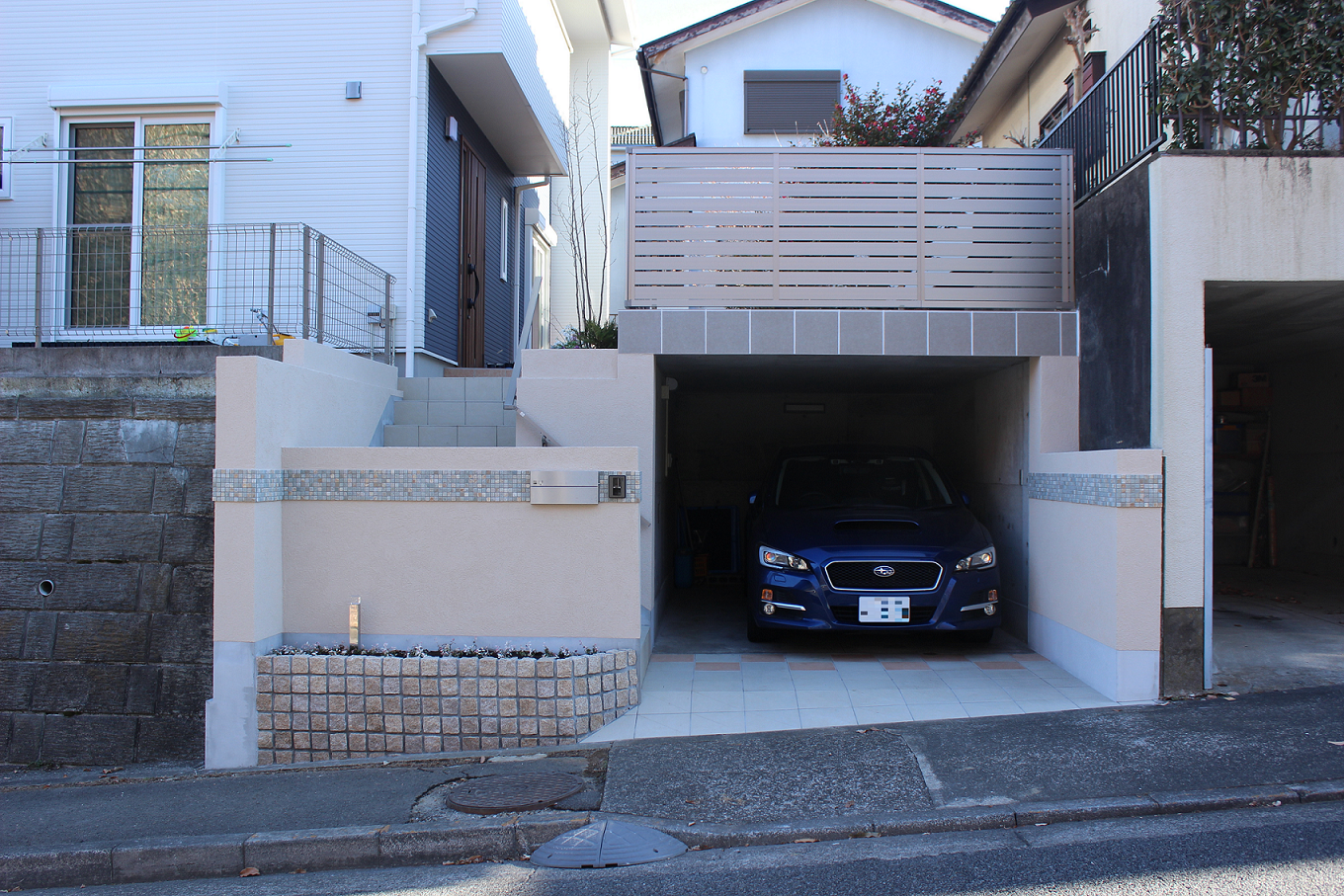 擁壁の高台にあるM様邸は、ビルトインガレージが設置されて、ステップ門周りも既存の構造物がありました。