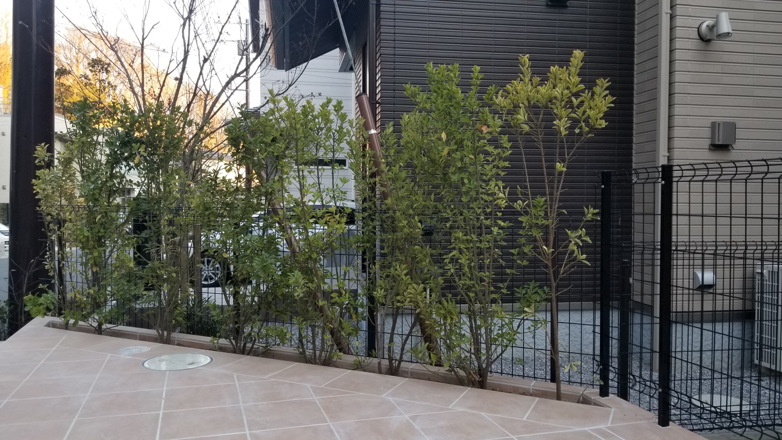 奥に見える生垣は常緑樹、もともと地植えしてあった植物をタイルテラスの上に移植しました。