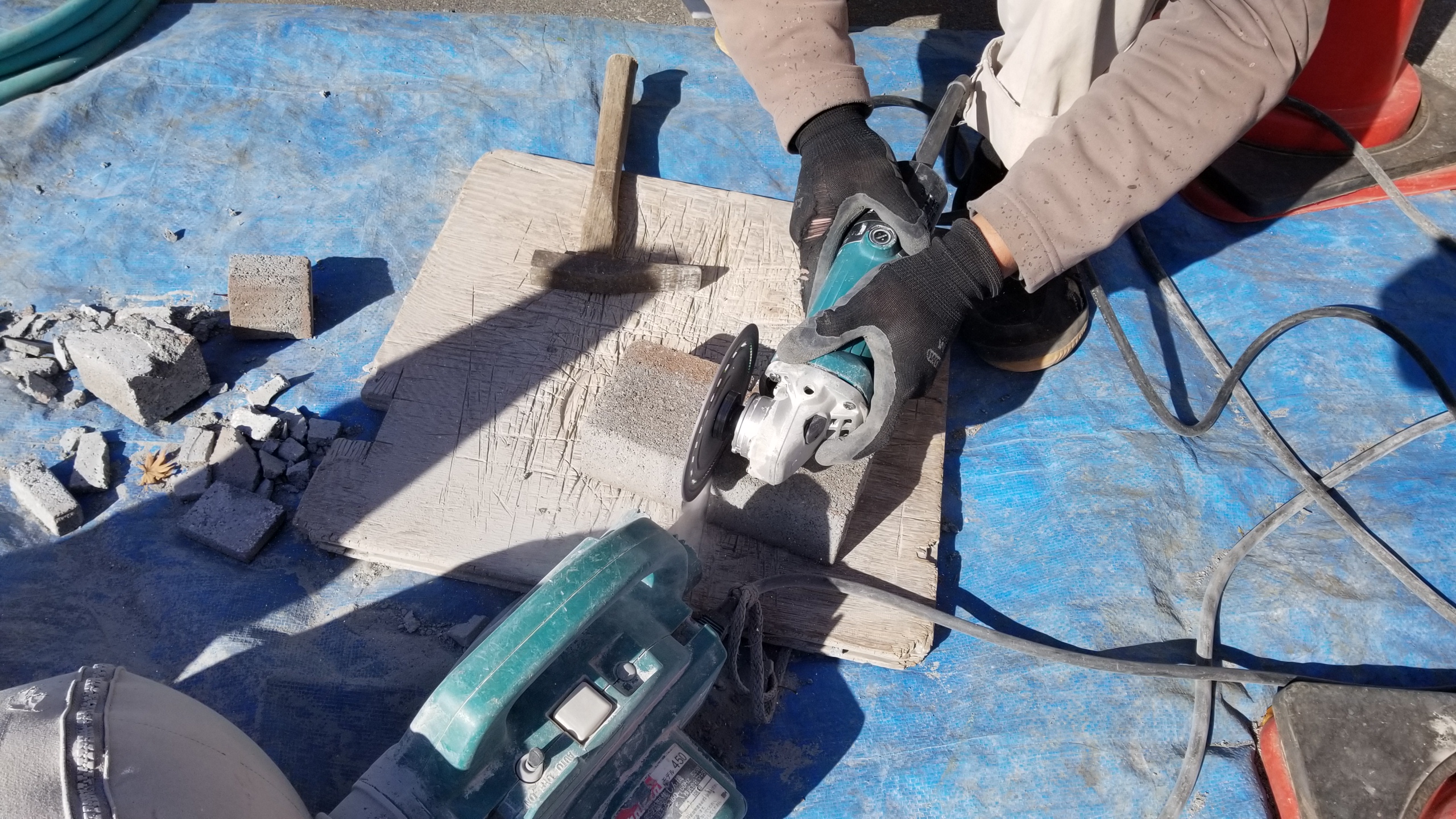 手に持っているのは石材切断用の機械、手前に見えるのは・・