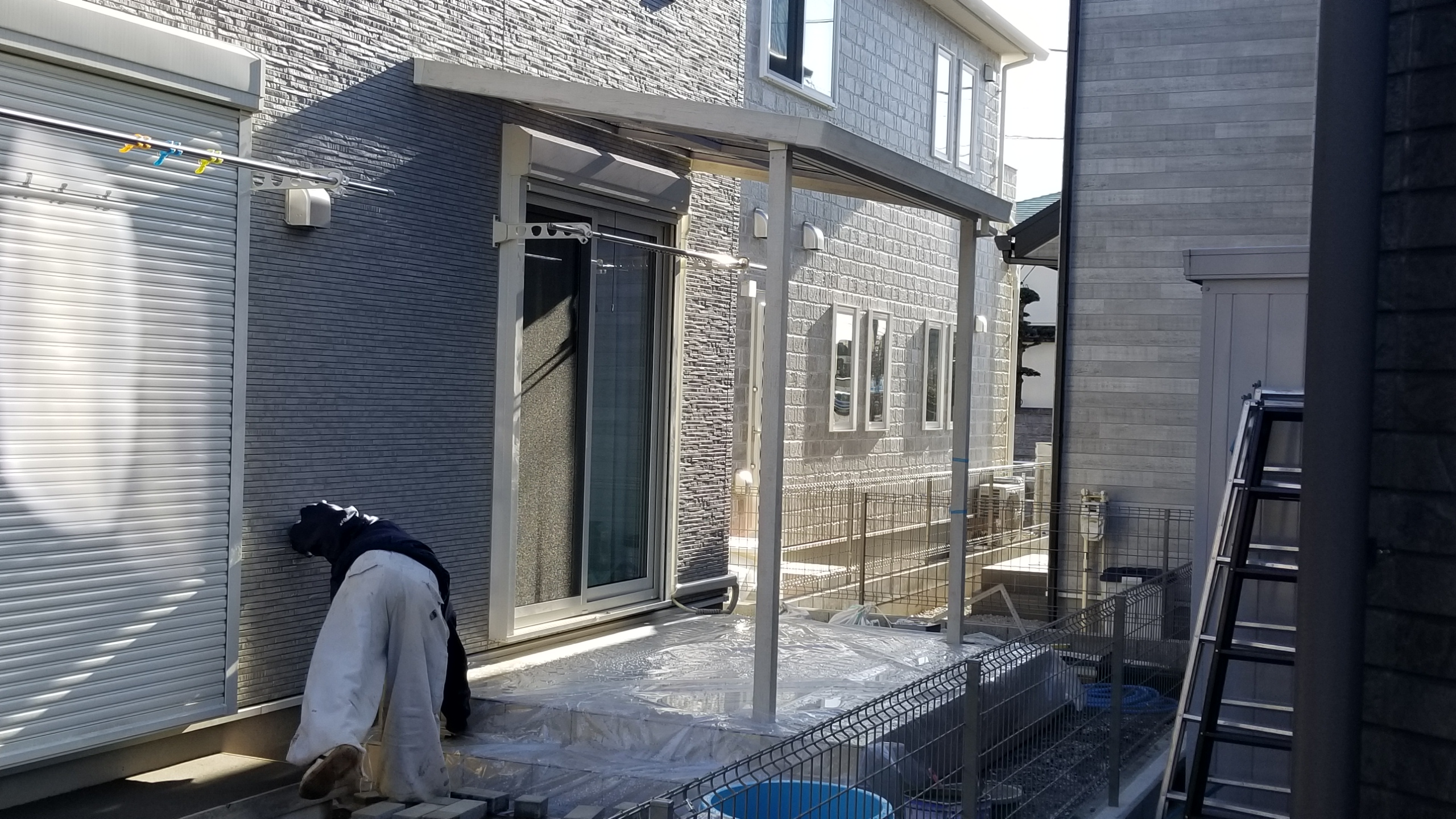 部屋とお庭を行き来できるタイルのテラスは人気で、こちらではテラス屋根の取り付けが完成したところです。