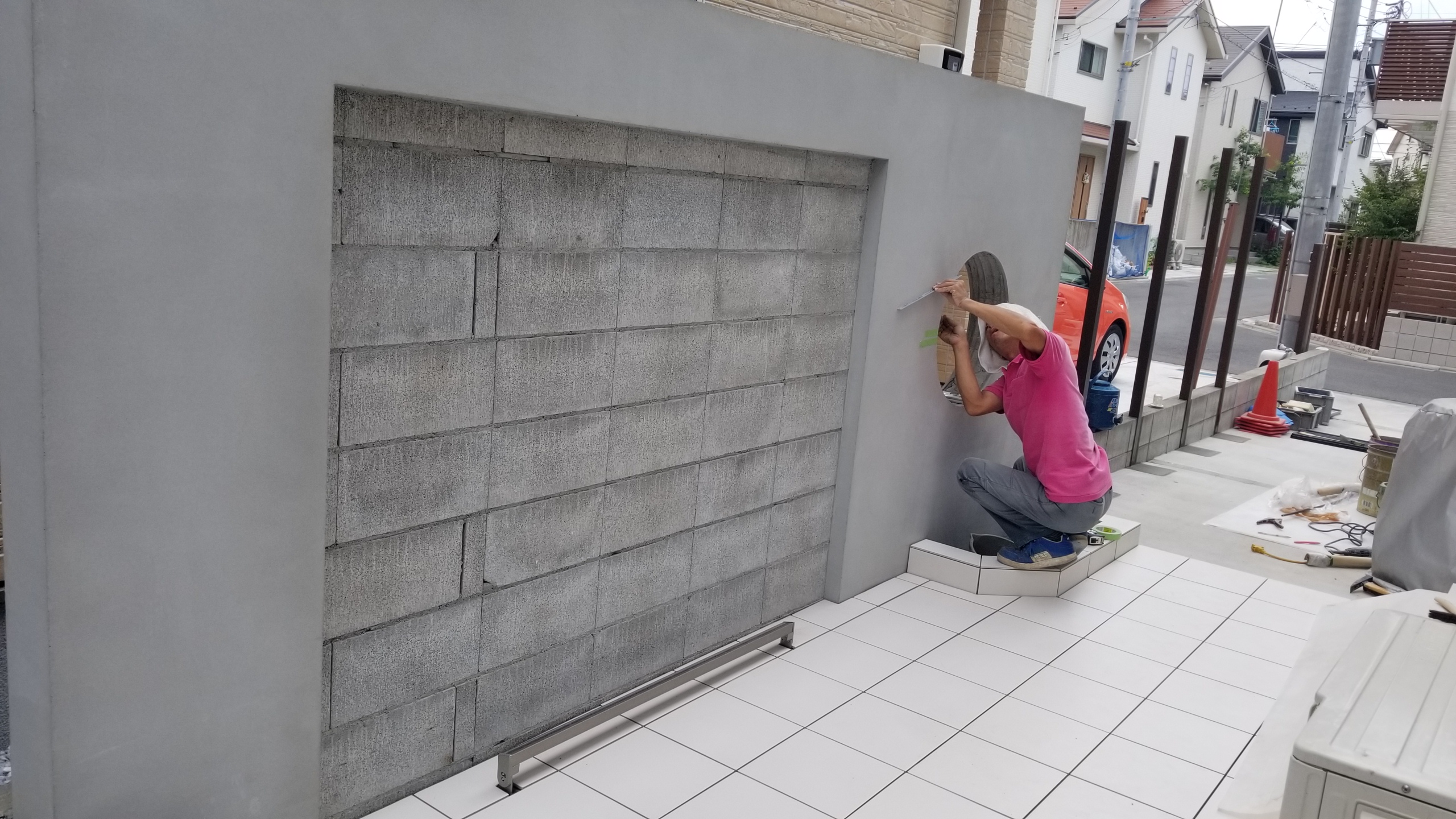 塗装する場所は、ブロックの目地が浮き出ないよう左官で仕上げます。