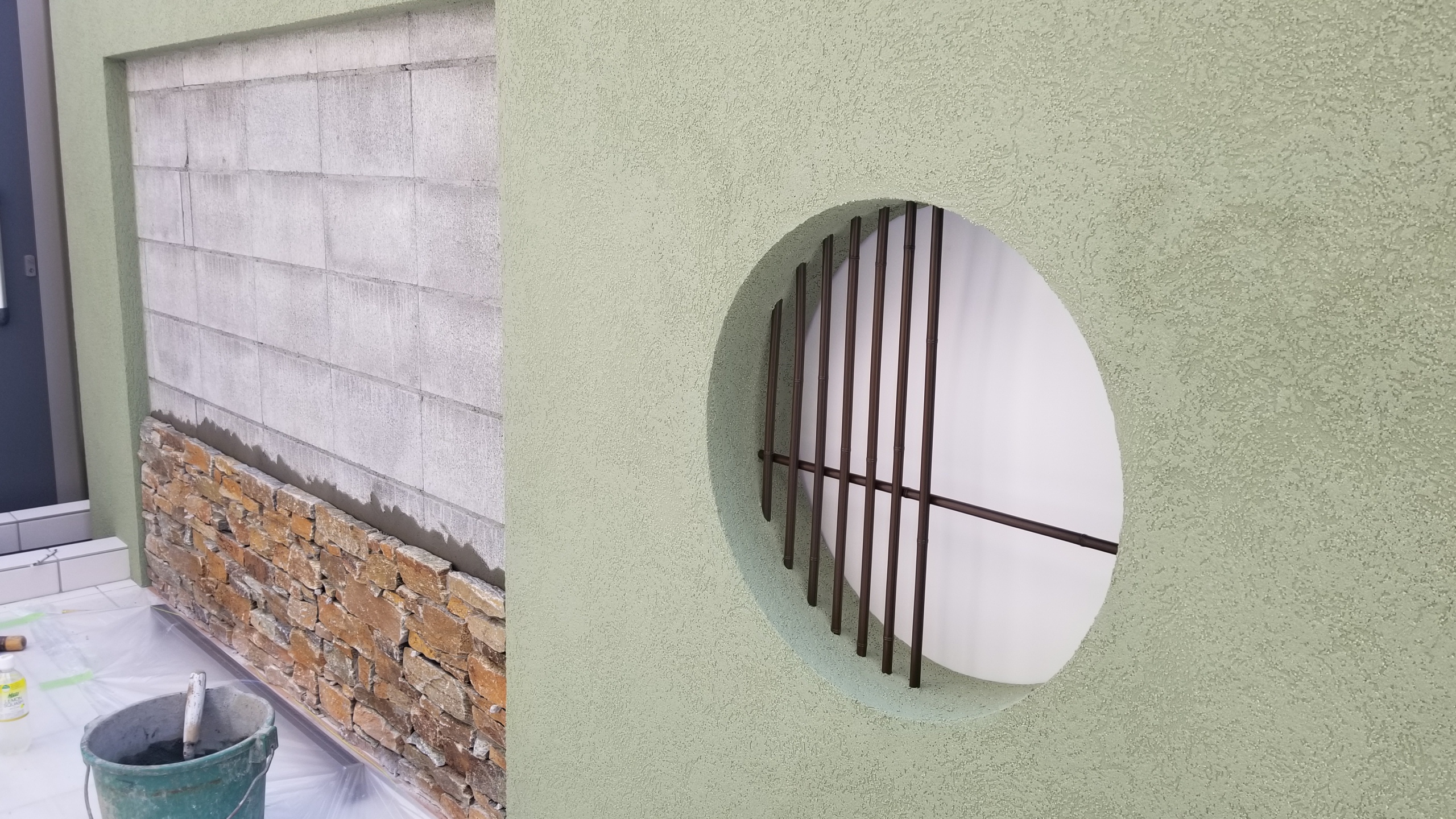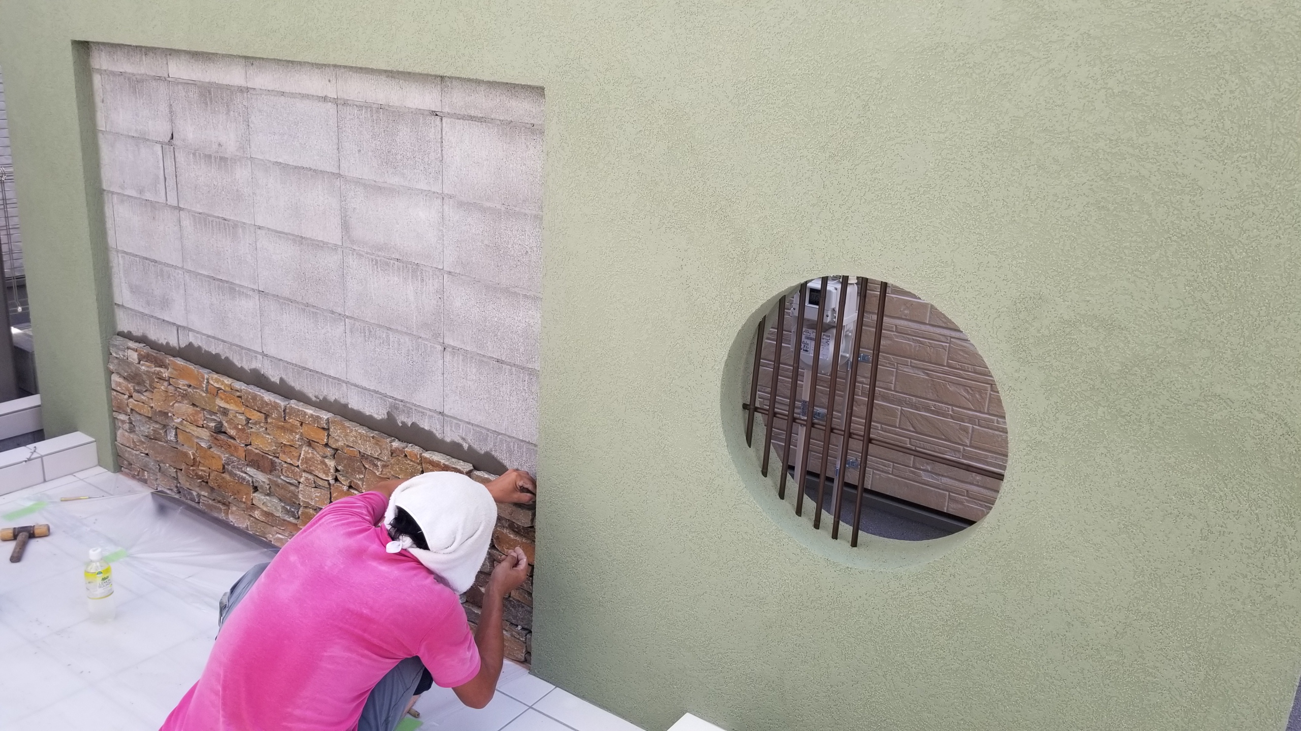 くぼんだ場所は自然石を貼り残りの場所はうぐいす色に塗装!