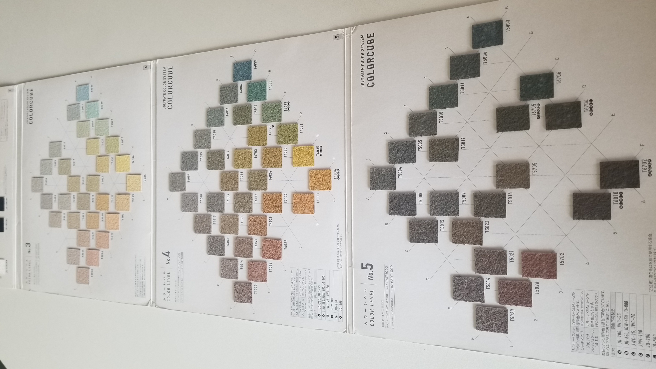 塗装する材料はジョリパットという塗装材、メーカー作成の色サンプルは1センチ×3センチほどです。