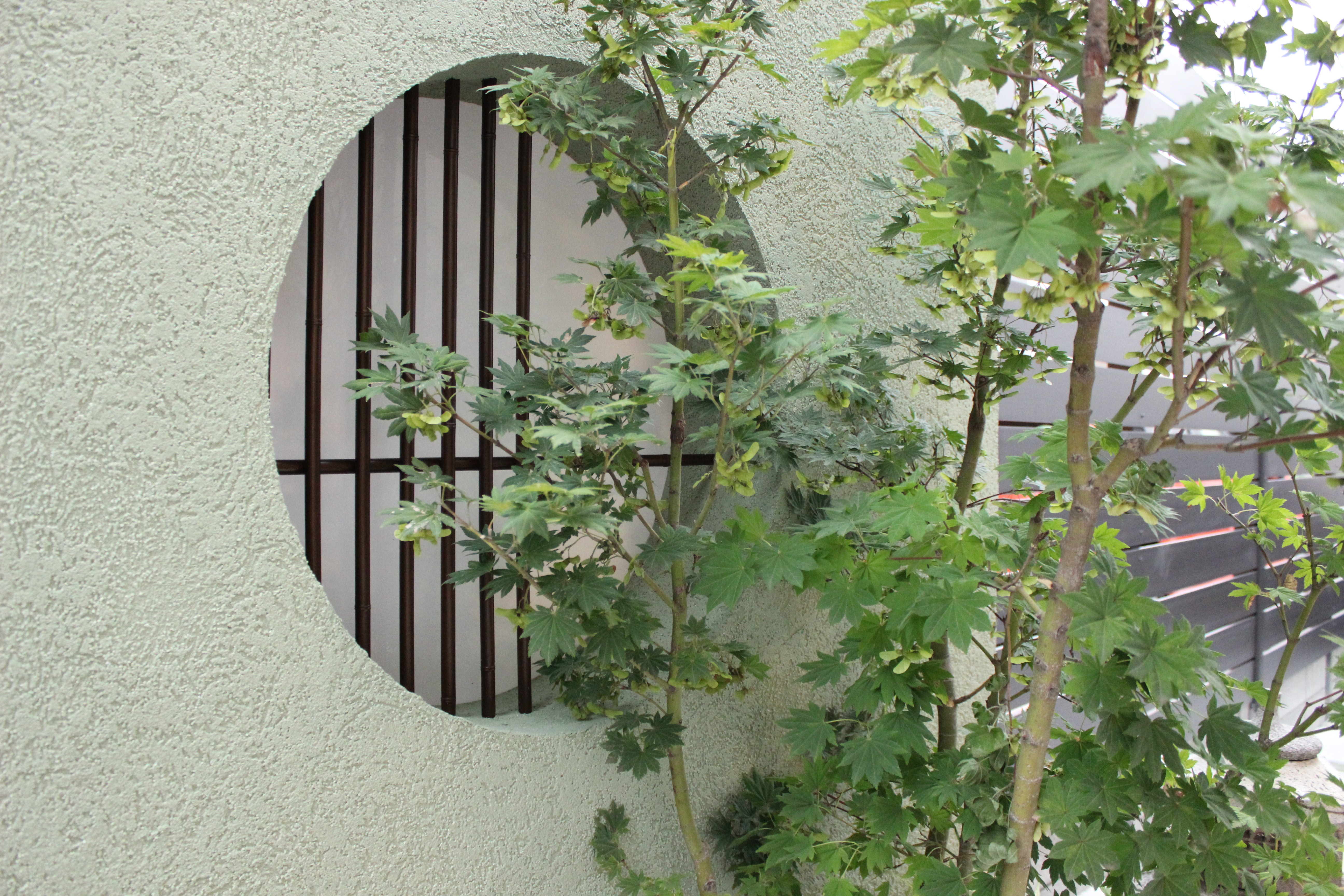 アクセントの石張りはアシンメトリーとして、楓を植える場所近くに月見窓を提案しました。