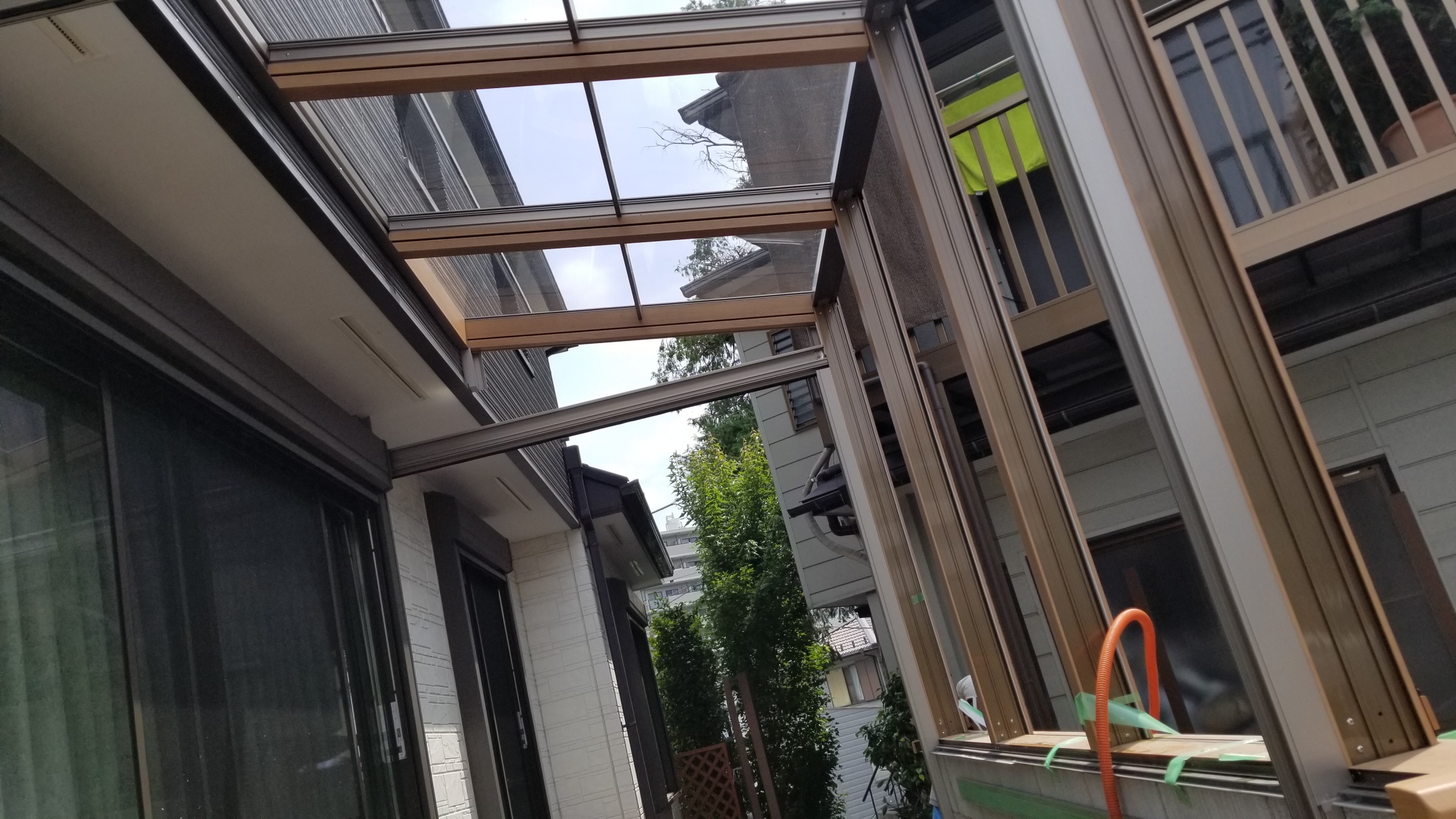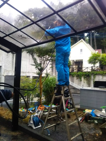 リガーデン工事中にお隣の方がカーポート屋根の掃除で困ってると