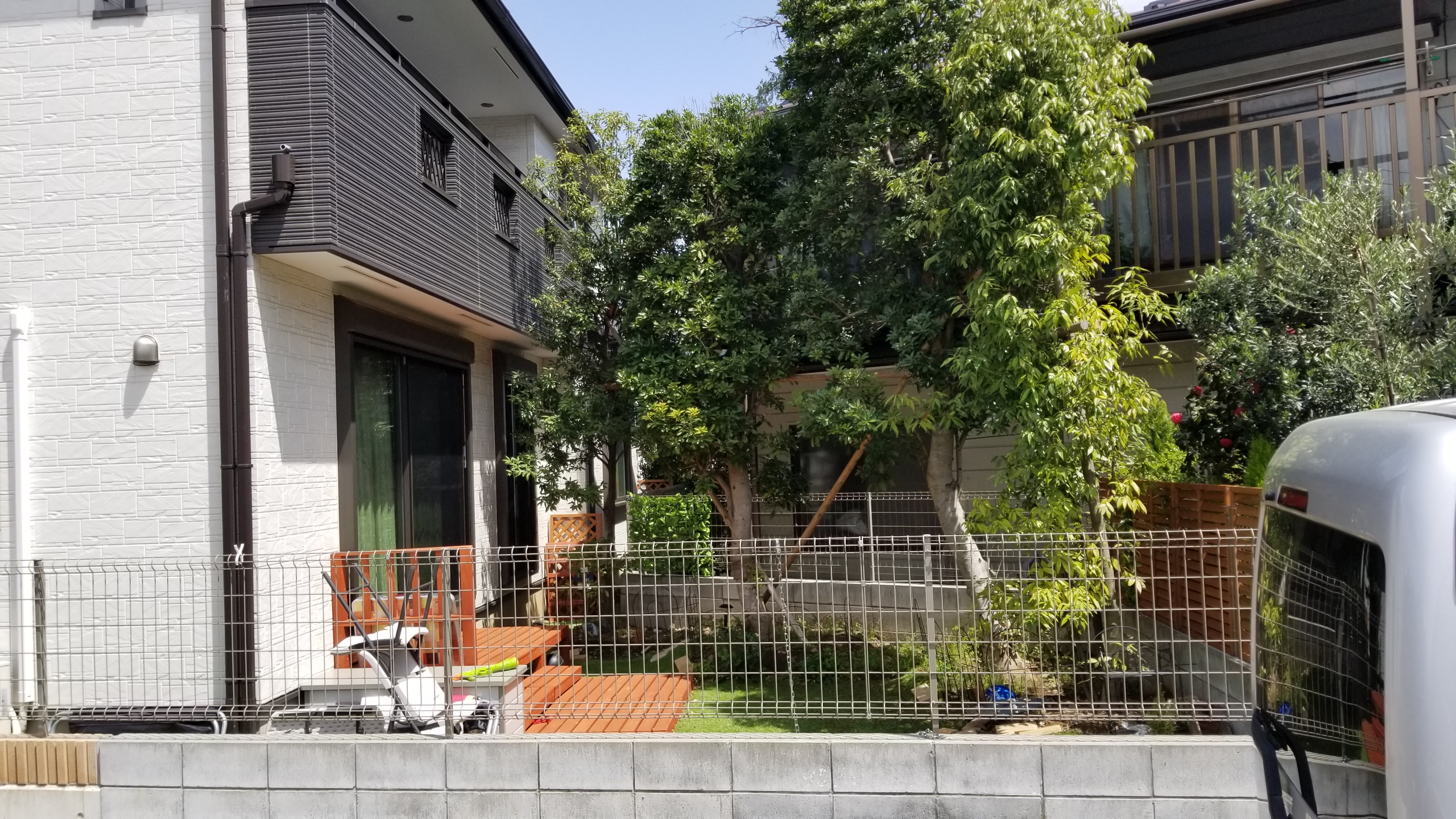 着工前は大きな木に、手作りしたウッドデッキのお庭。