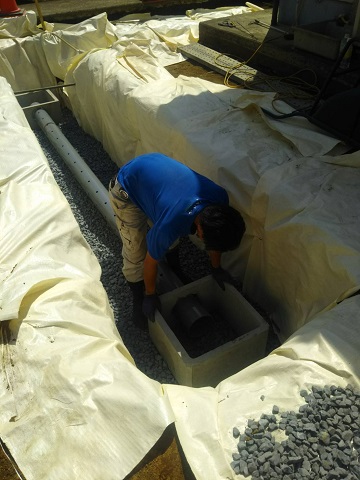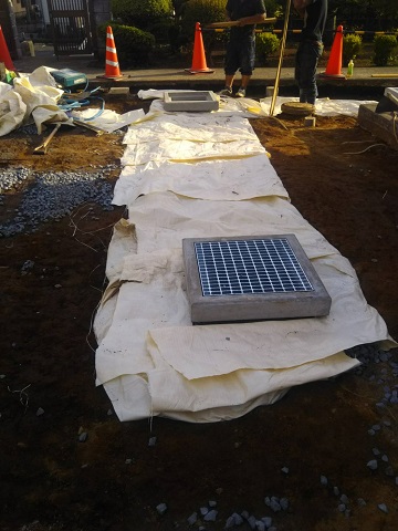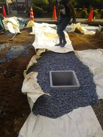 続いて、コンクリートの面積にあわせて、雨水を浸透できる容積の浸透桝を設置します(=゚ω゚)ノ