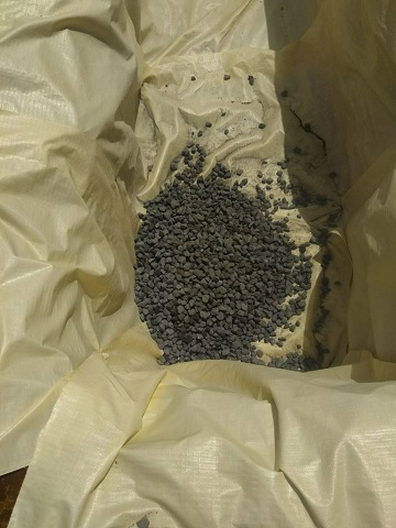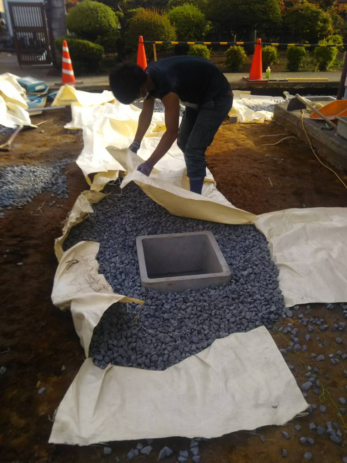 あとは透水シートの中にひたすら単粒砕石を入れて、