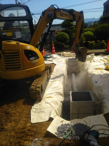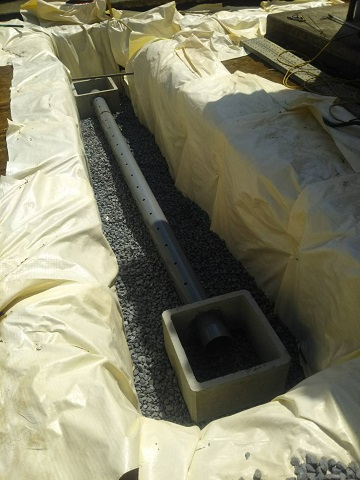 浸透改良桝を設置後、有孔管(通常の塩化ビニル製パイプと違い排水できるように穴が開けてある塩化製ビニルパイプ)