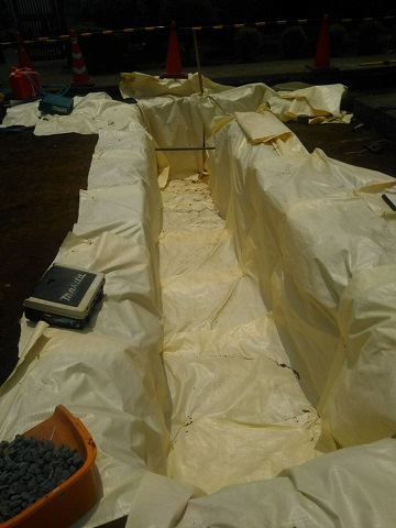 敷いてある透水シートの端を上から包むように巻いて泥が上から