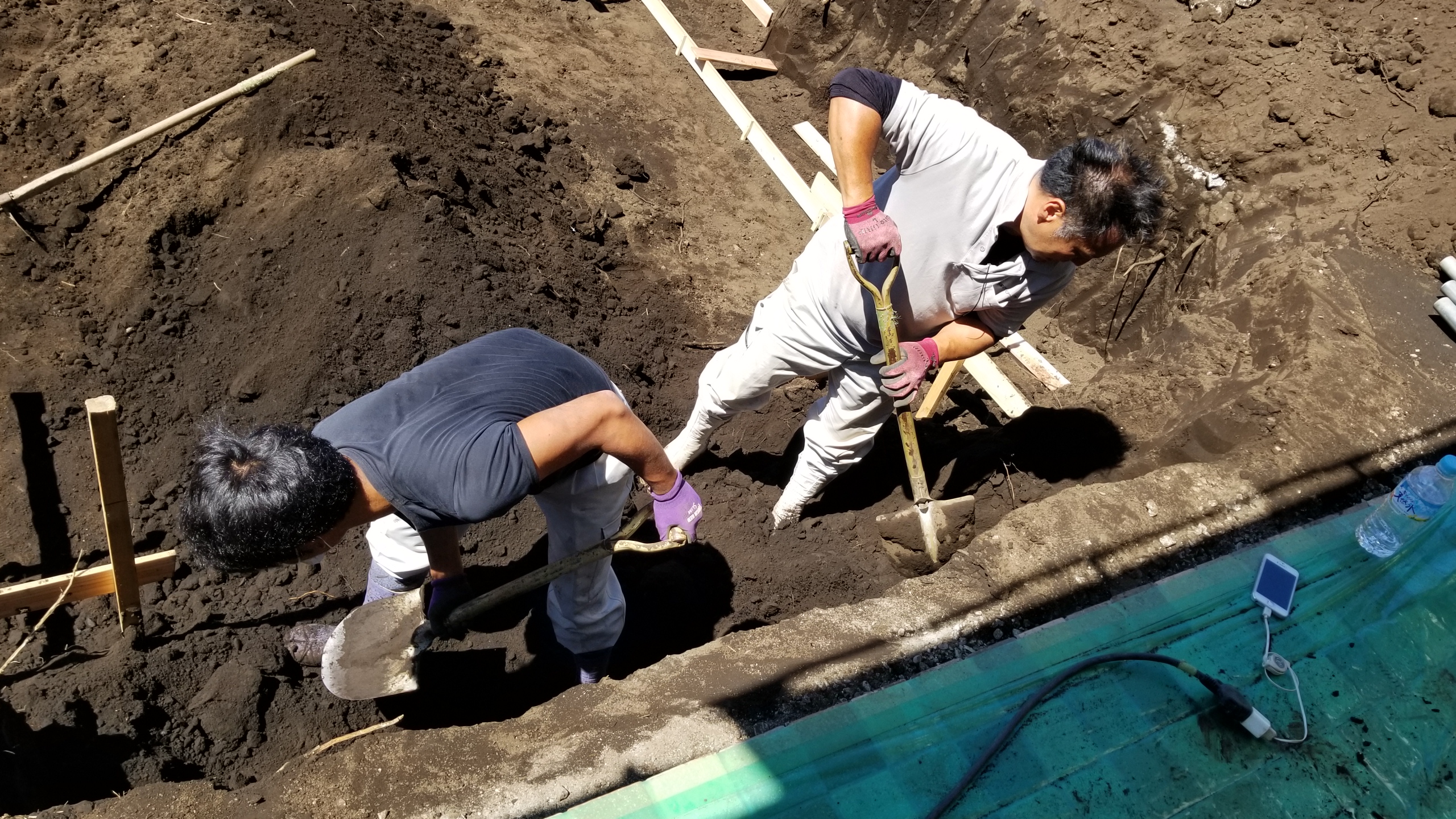 大雑把な部分は重機を使い細かな場所は手作業!汗ばむような天候の中、職人さんたちも頑張ってくれてます(*^^*)