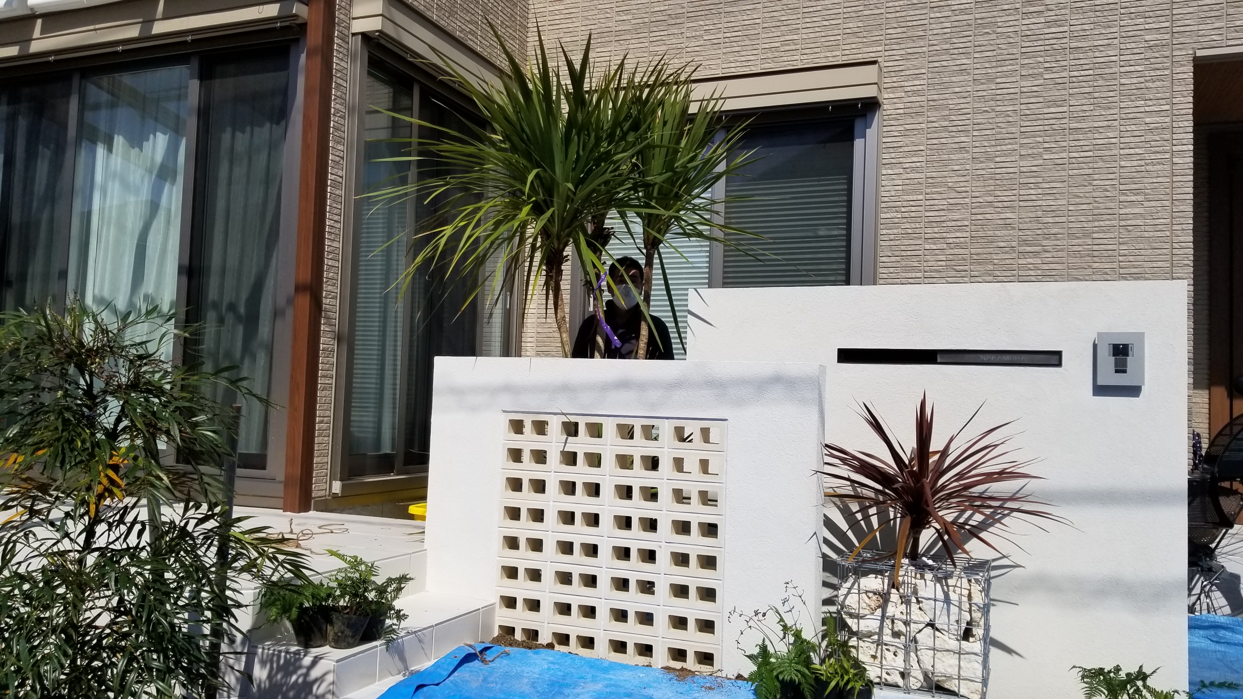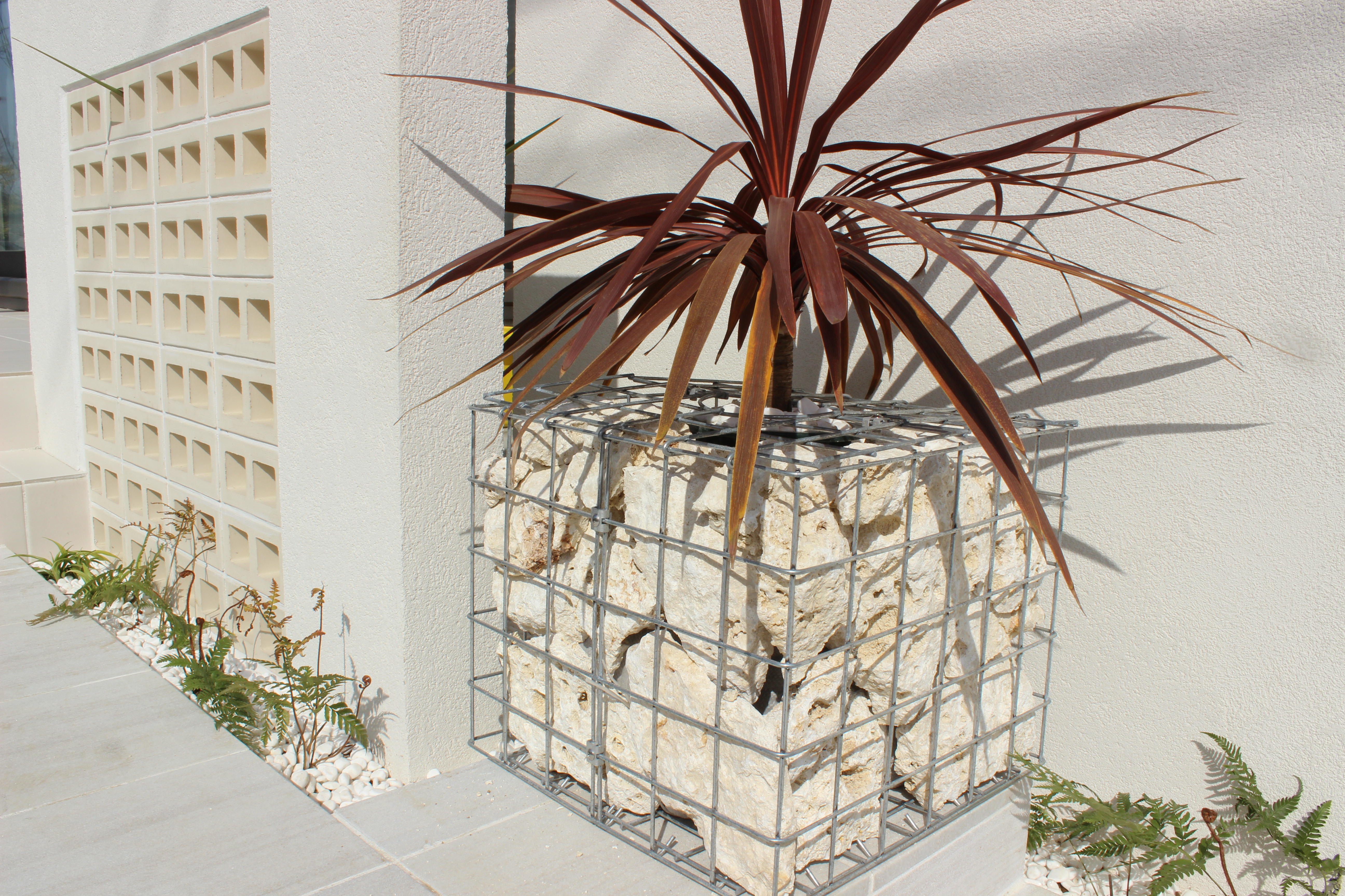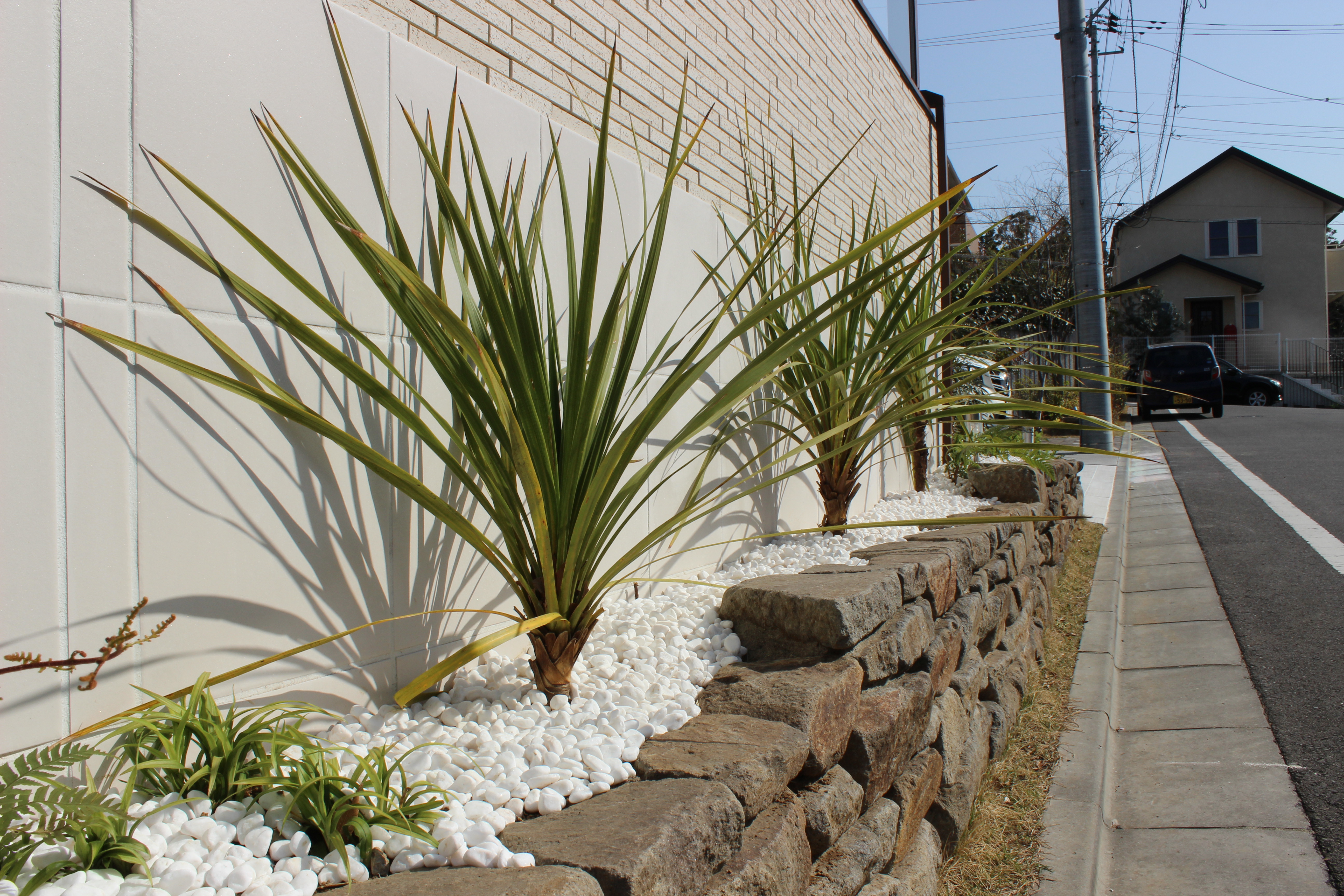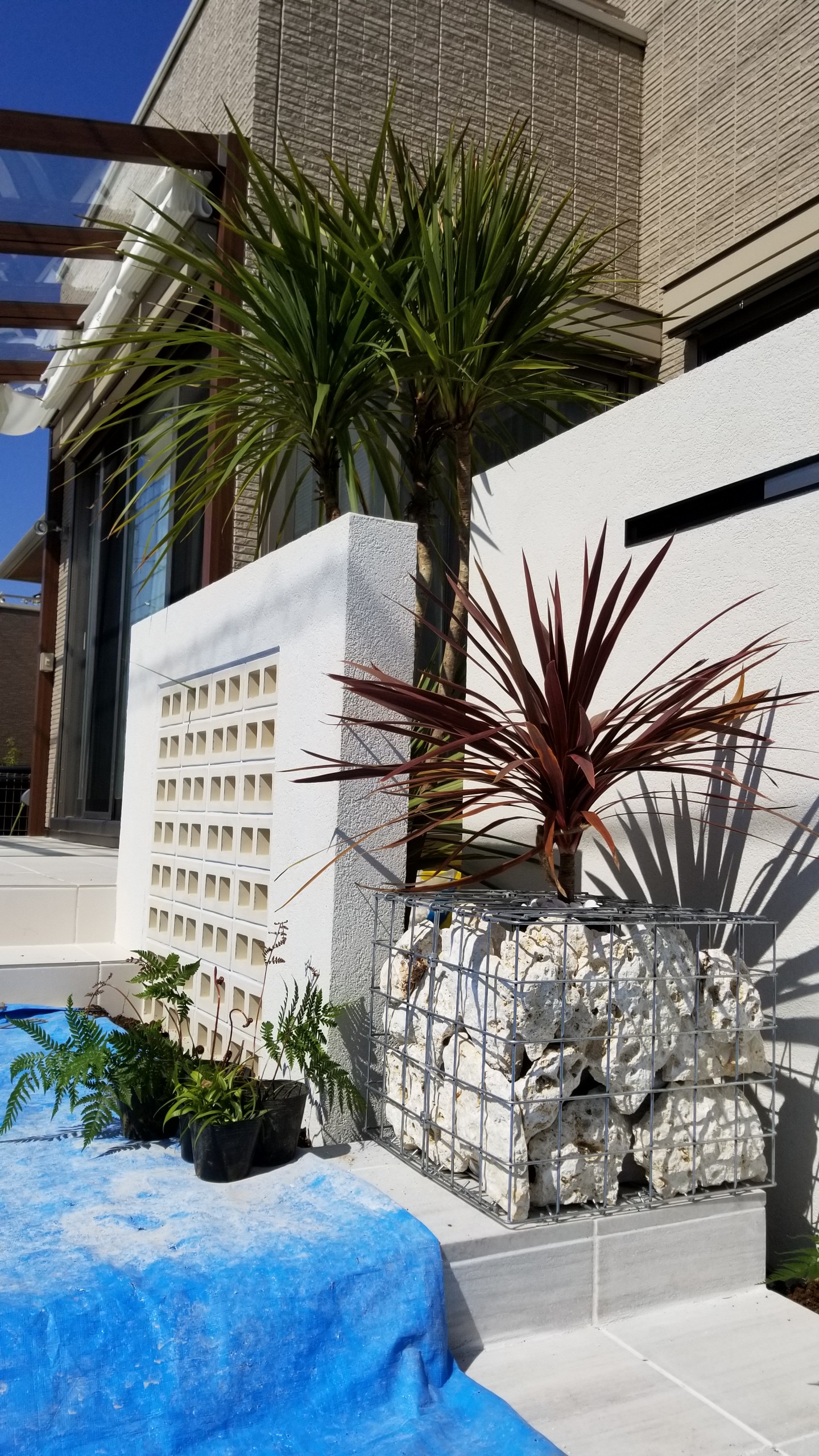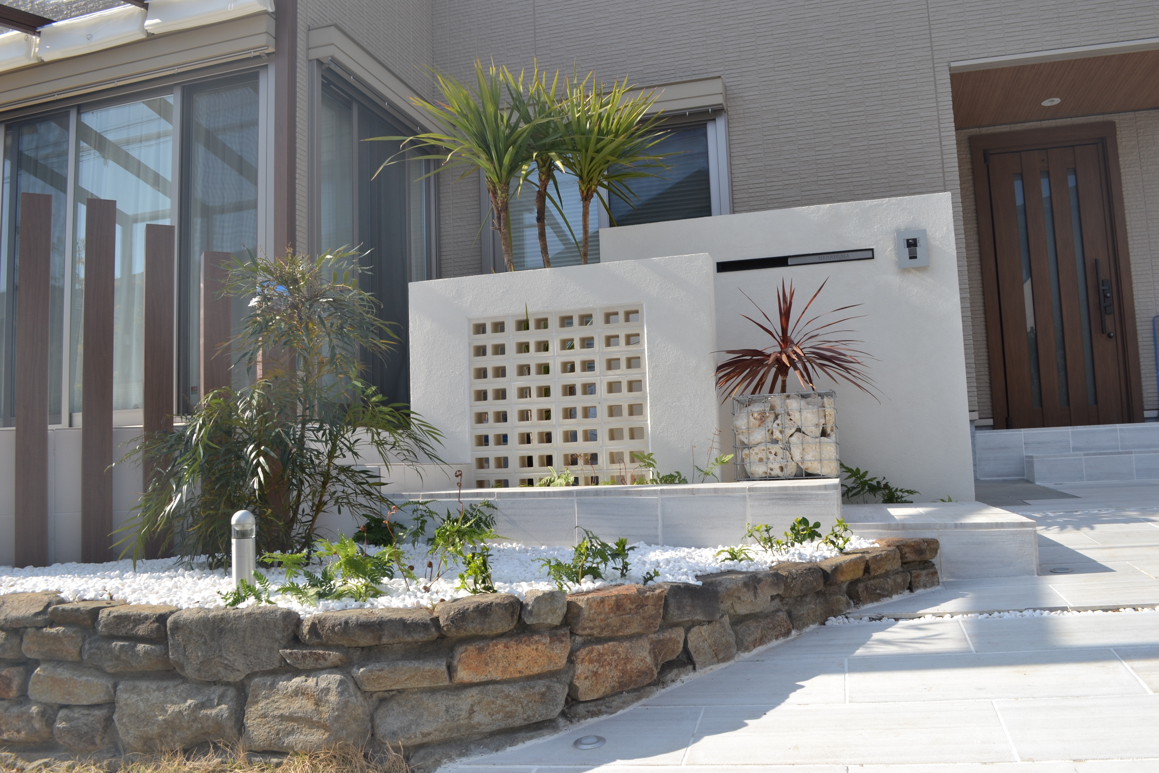 その前にグリーンボックスを置き、中に琉球石灰岩を詰めコルジリネを植栽して南国風を表現しました。