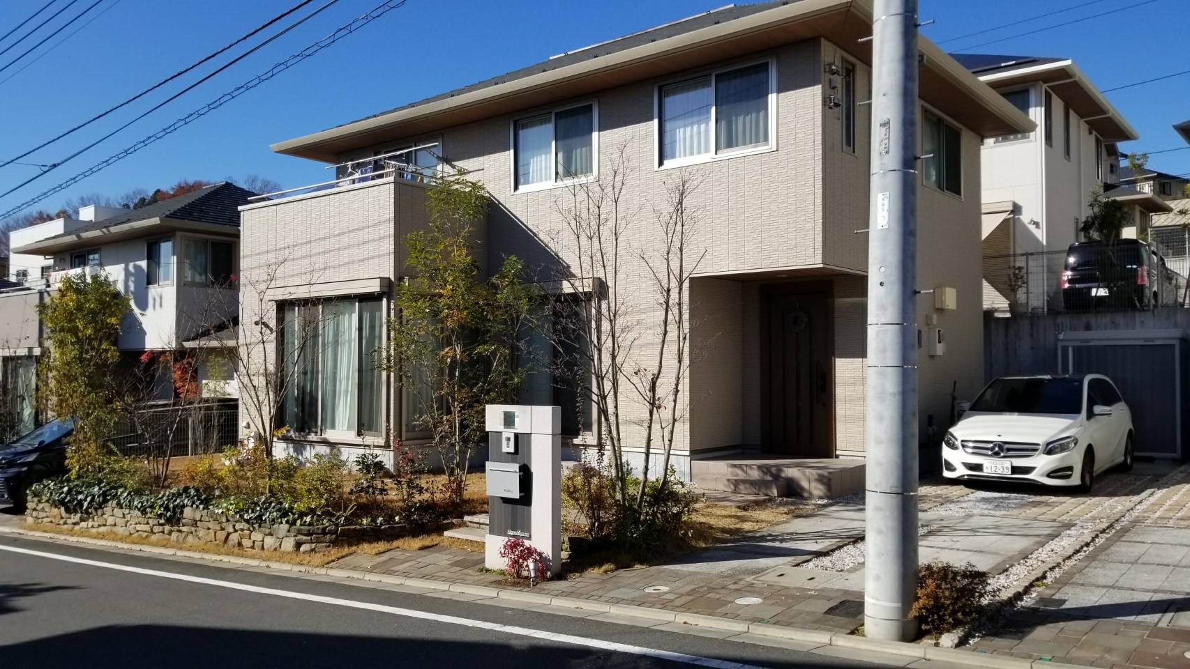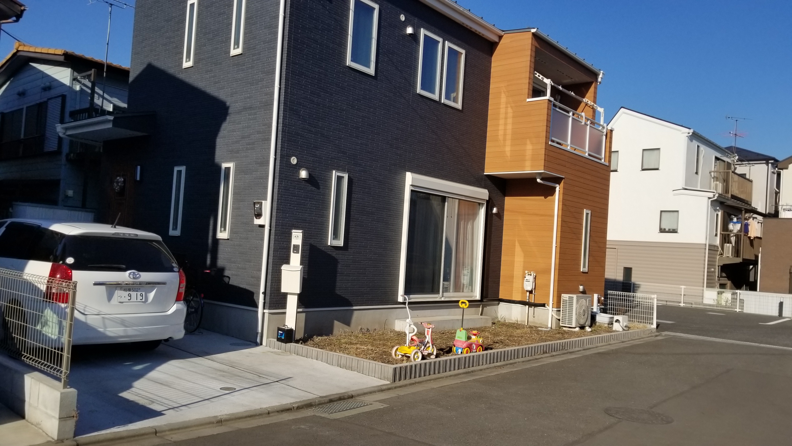 生活用の道路が目の前にあり、ちょうどTの字ドン付きに建築されたT様邸