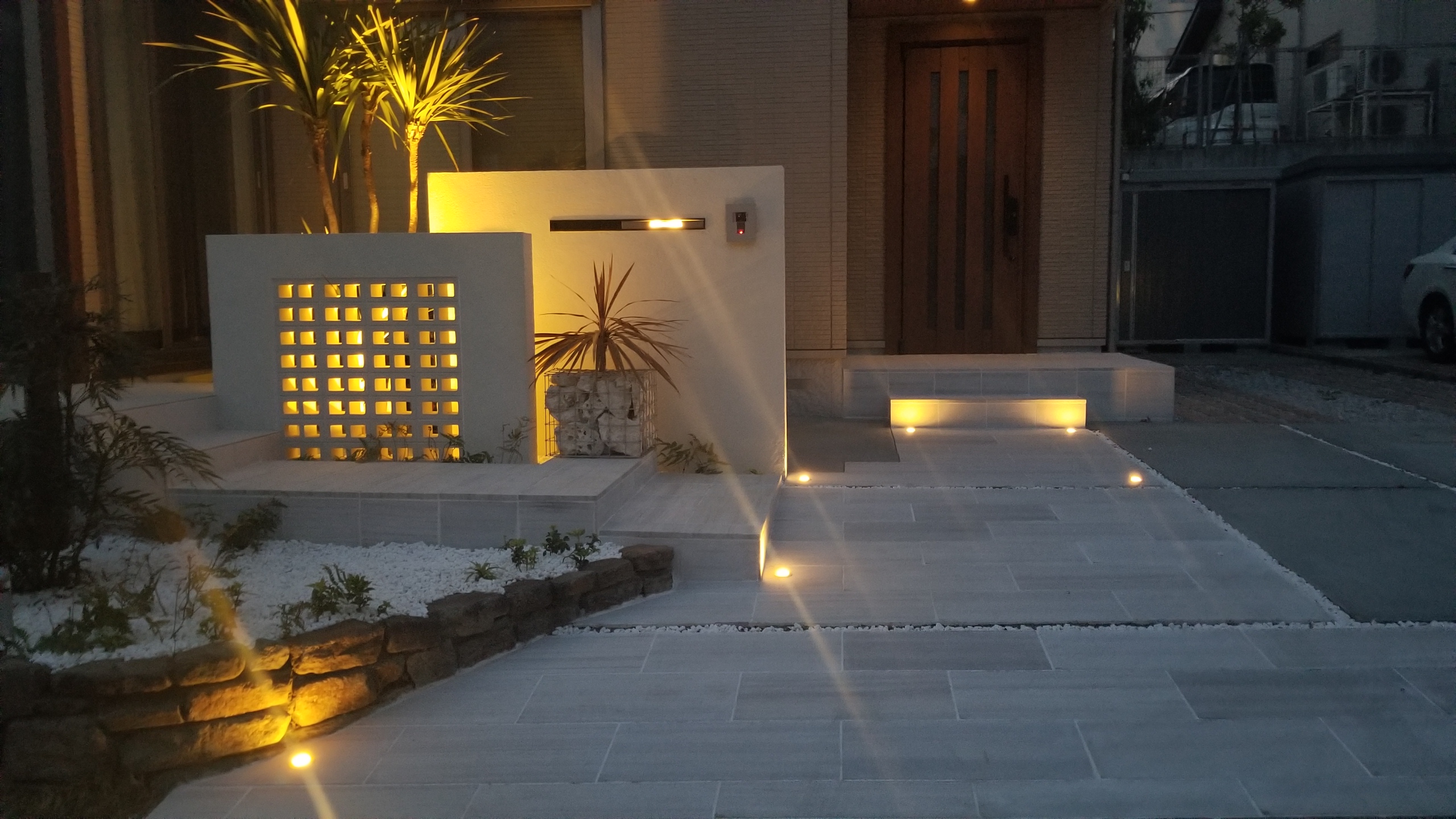 サブ門袖に組積したホローブリックからこぼれる明かりが良い雰囲気を醸し出してます(*^^)v