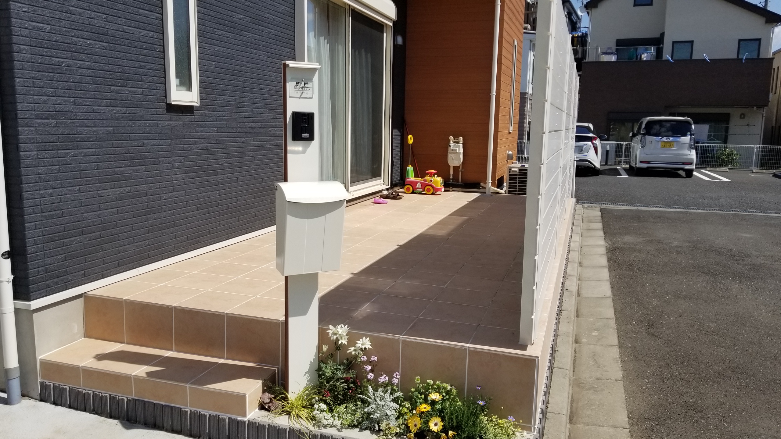 お庭に大きなタイルデッキが完成しました。