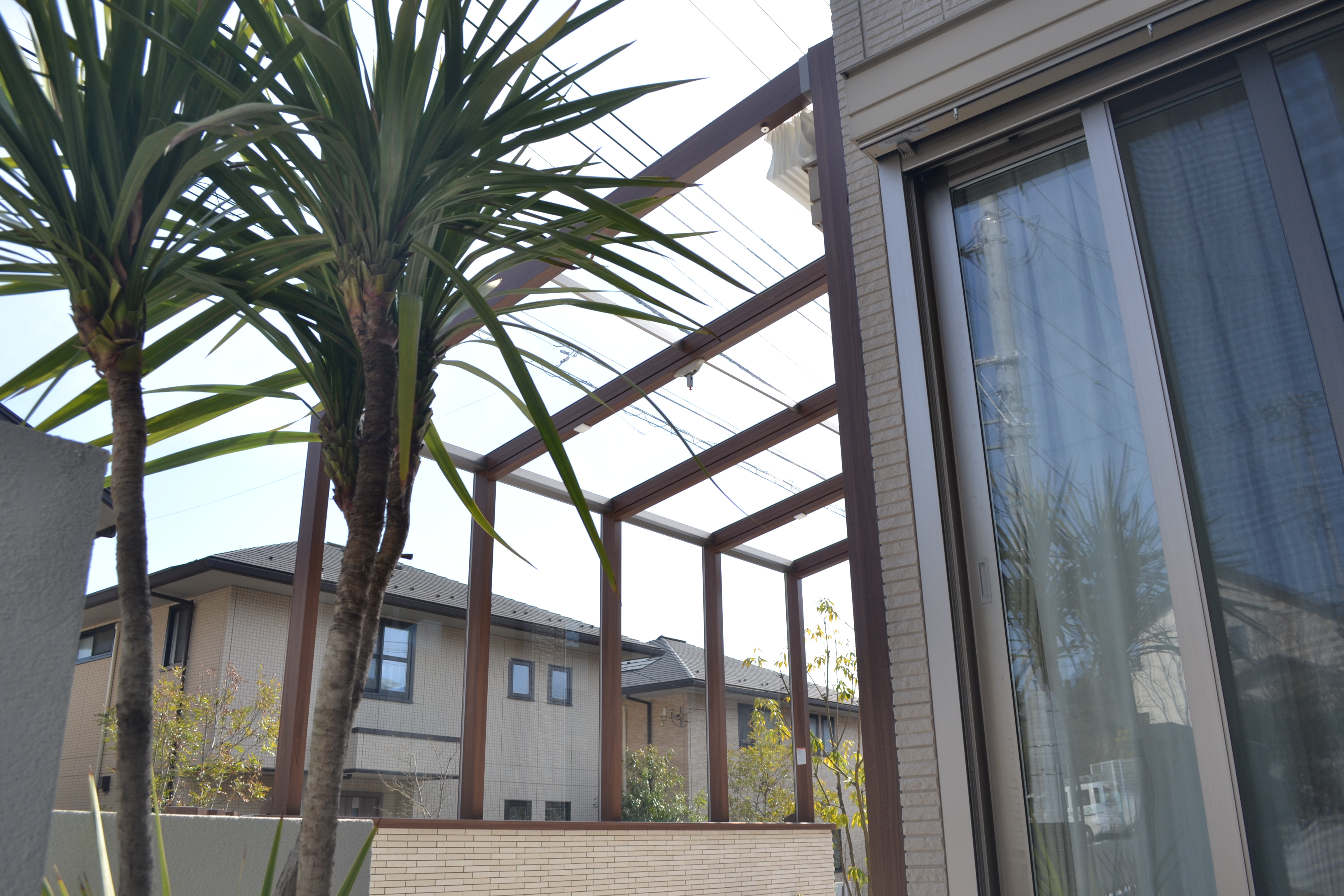 テラスの腰壁前はアクセントツリーにコルジリネの青葉を植えました。ヤシ系の特殊樹を植えるとリゾートっぽさが一段と増しますね(^^♪